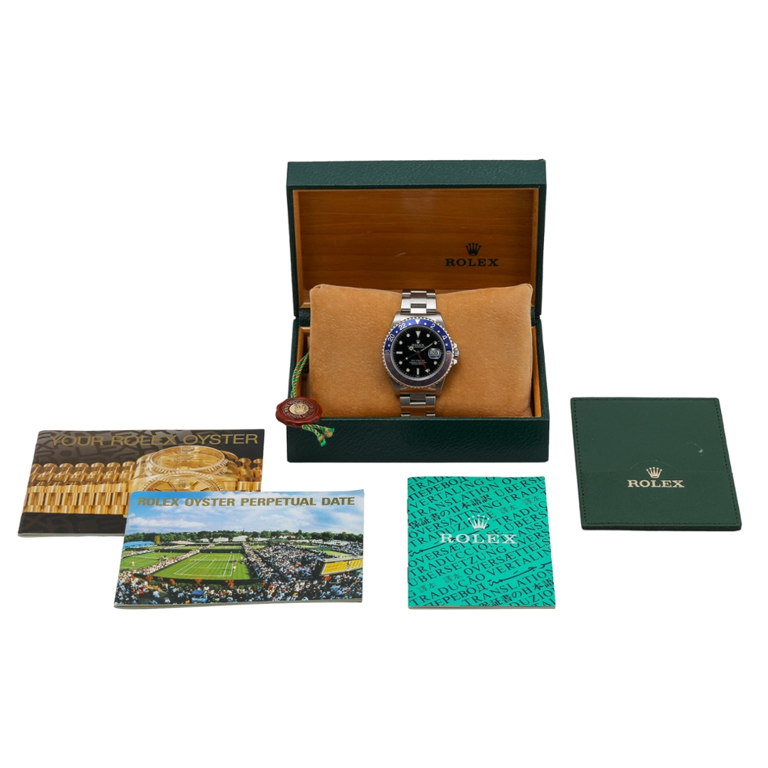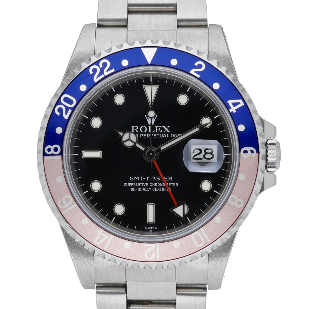 A Rolex GMT-Master Watch, Stainless Steel with a Blue/Red Bezel and a Black Dial.