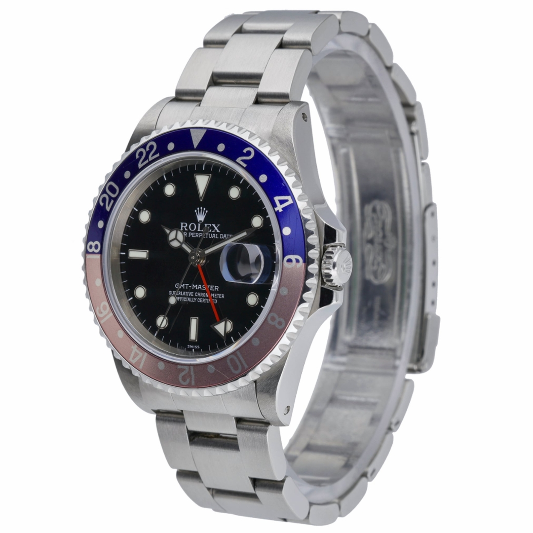 A Rolex GMT-Master Watch in stainless steel, featuring the iconic red and blue aluminium “Pepsi” bezel and a classic black dial. The 40mm Oyster case delivers the balanced proportions that made the GMT-Master one of Rolex’s most recognisable professional watches, originally designed for international pilots. Luminous hour markers, Mercedes hands and the Cyclops date window create the unmistakable Rolex sports watch aesthetic that has remained largely unchanged for decades.