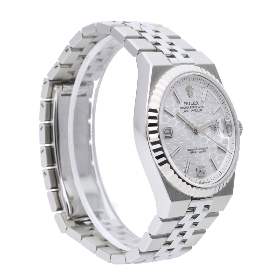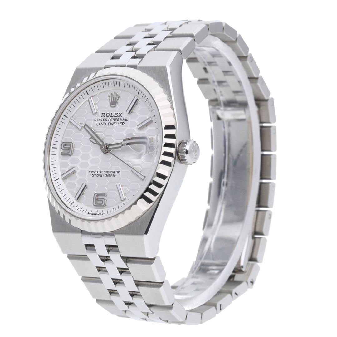 A Rolex Land-Dweller 36 Watch, Stainless Steel with an 18ct White Gold Bezel on an Intense White Honeycomb Motif Dial and a Flat Jubilee Bracelet