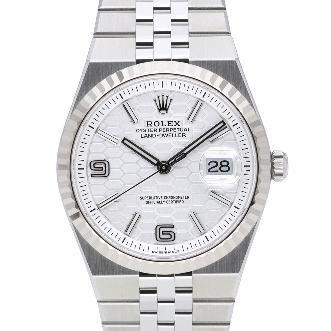 A Rolex Land-Dweller 36, reference 127234, represents one of the most strategically significant modern releases from Rolex, introduced in 2025 and already attracting strong collector and investor attention. Crafted in stainless steel with an 18ct white gold fluted bezel, it features the distinctive intense white honeycomb motif dial, a design exclusive to the Land-Dweller line and unlikely to remain in long-term production. The 36mm case offers broad market appeal, balancing contemporary presence with classic proportions, while the flat Jubilee bracelet adds further differentiation from standard Datejust configurations.