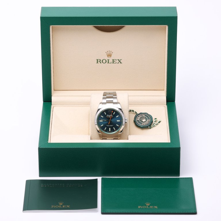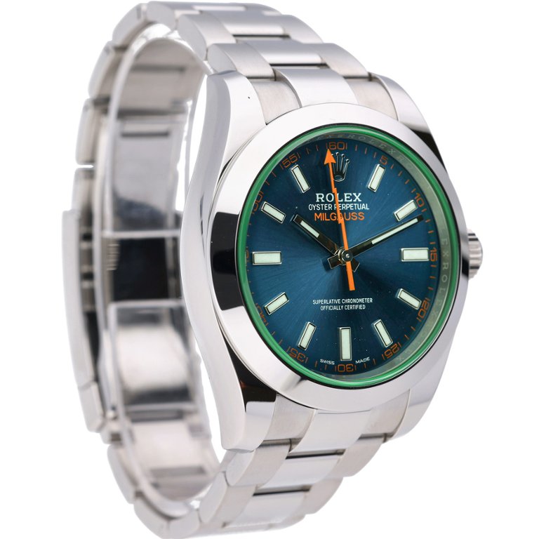A Rolex Milgauss 116400GV is presented in stainless steel with a vibrant blue dial, framed by the distinctive green-tinted sapphire crystal unique to this model. The 40mm Oyster case offers balanced proportions, while luminous baton hour markers and the signature lightning-bolt seconds hand provide both clarity and character. The smooth bezel and Oyster bracelet complete the watch’s clean, technical aesthetic.