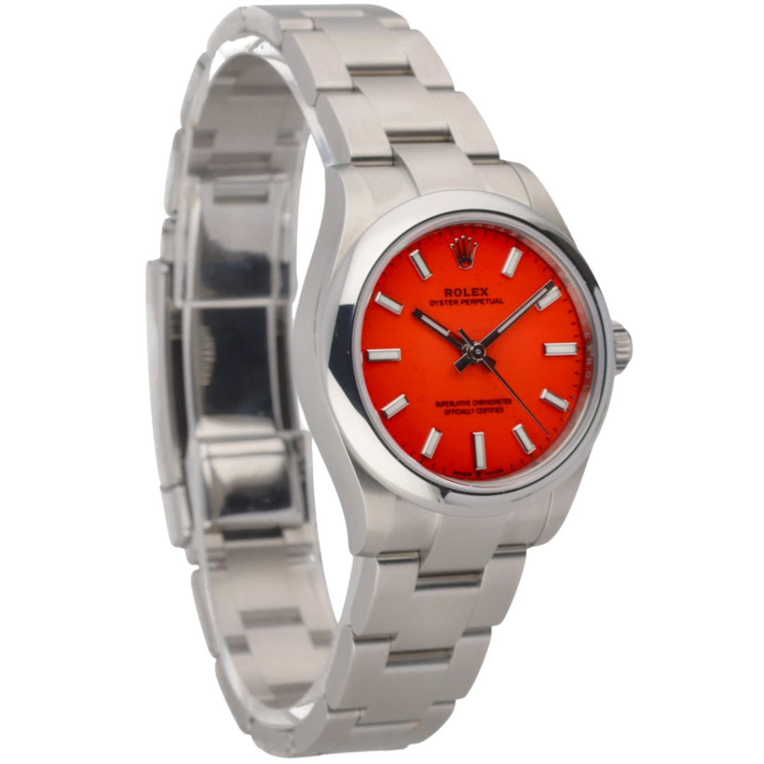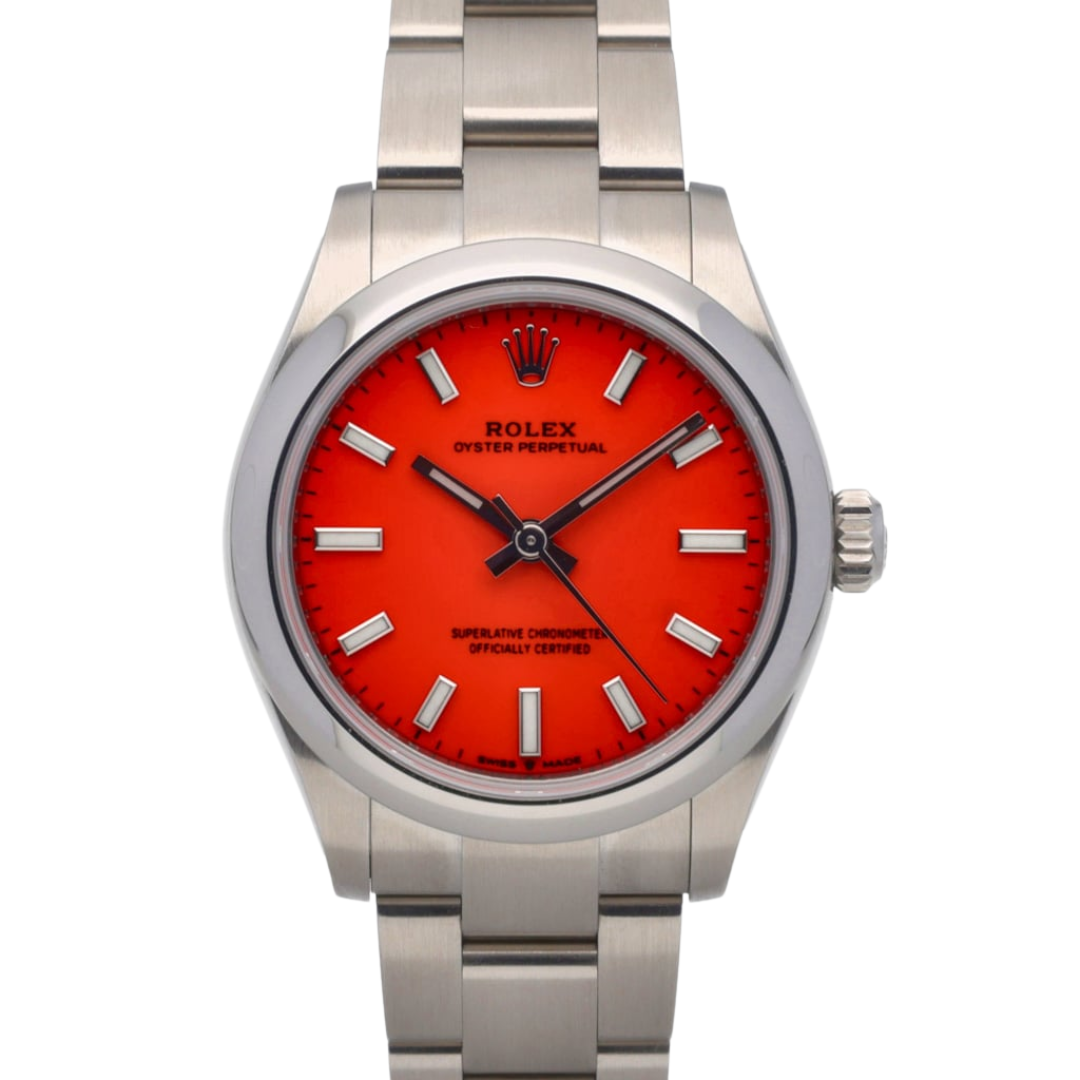 This Rolex Oyster Perpetual reference 277200 is presented in stainless steel and paired with the striking red dial that defines the modern Oyster Perpetual range. Measuring 31mm, the Oyster case offers balanced proportions with a refined wrist presence, while the smooth bezel and clean dial layout underscore the model’s timeless, everyday appeal. The vivid red finish adds a contemporary edge to one of Rolex's most recognisable designs.