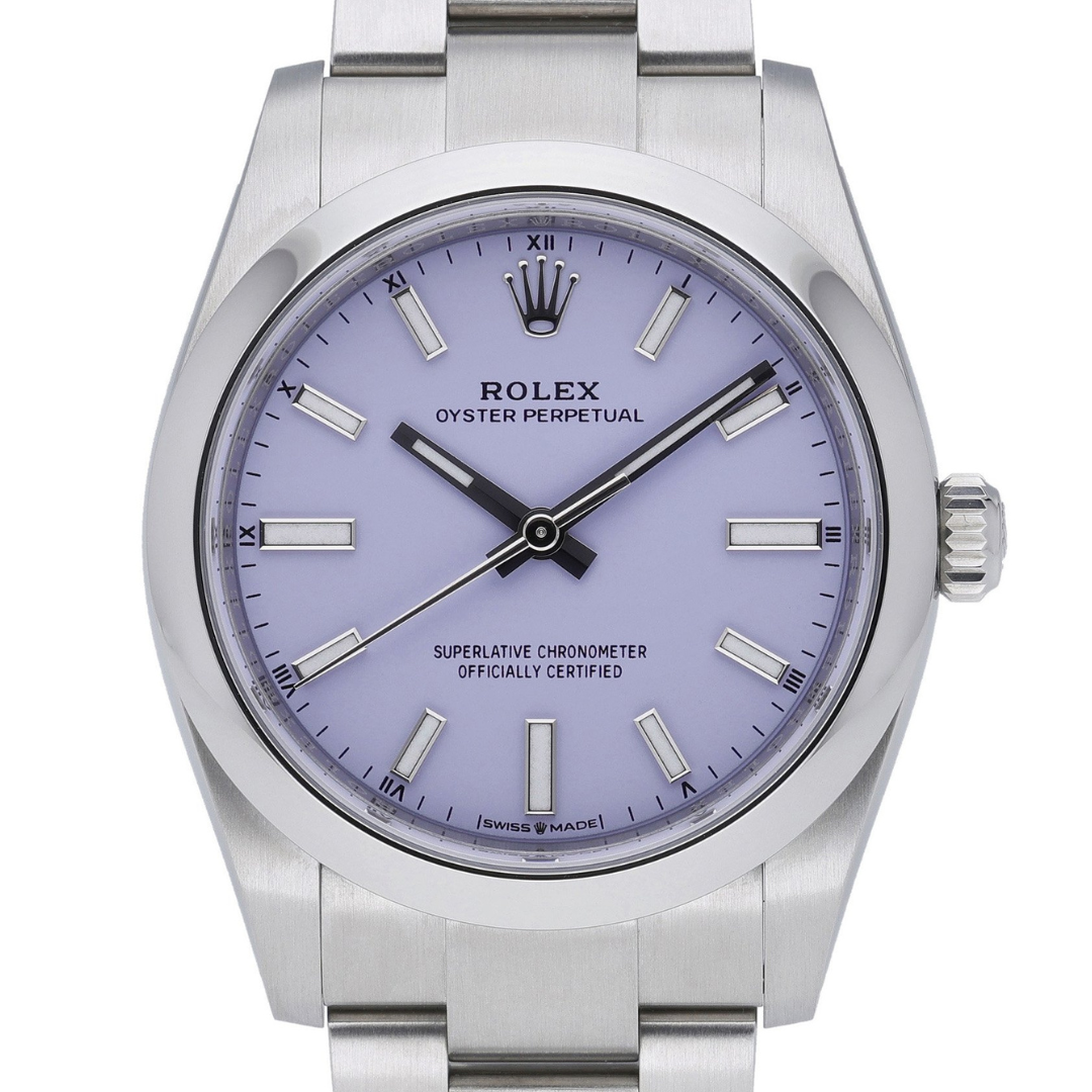 This 2025 Rolex Oyster Perpetual 41 reference 134300 presents the new-generation Lavender dial, a colour that has quickly become one of the most sought-after additions to the OP line. The soft pastel tone is balanced by crisp white-gold hour markers and hands, giving the dial a clean, contemporary aesthetic while retaining the familiar clarity associated with the Oyster Perpetual.