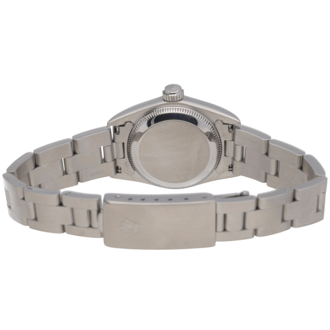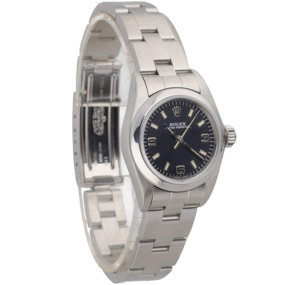 A Rolex Oyster Perpetual 67180, presented in a 24mm stainless steel Oyster case, offering a classic and understated entry into Rolex ownership. The black dial features applied baton hour markers and Arabic numerals at 3, 6, and 9, delivering a balanced, highly legible display. The smooth, domed bezel enhances the clean aesthetic, while the compact case size ensures a refined, versatile wrist presence suited to everyday wear.