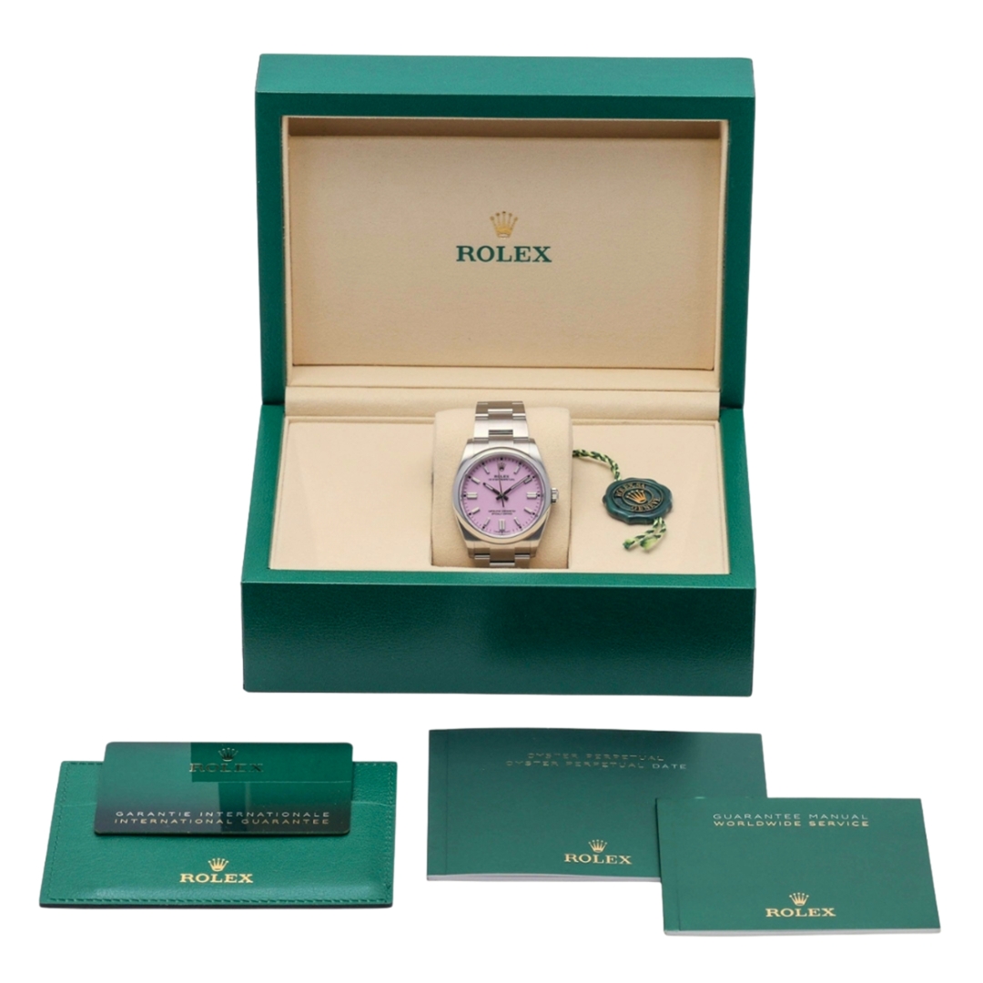 A Rolex Oyster Perpetual 36 126000, presented in a 36mm Oystersteel case, offering a bold yet refined take on Rolex’s classic time-only design. The pink dial delivers a distinctive and contemporary aesthetic, complemented by applied baton hour markers and Chromalight-filled hands for excellent legibility in all conditions. The smooth domed bezel enhances the clean, minimalist profile, reinforcing the timeless appeal of the Oyster Perpetual collection.