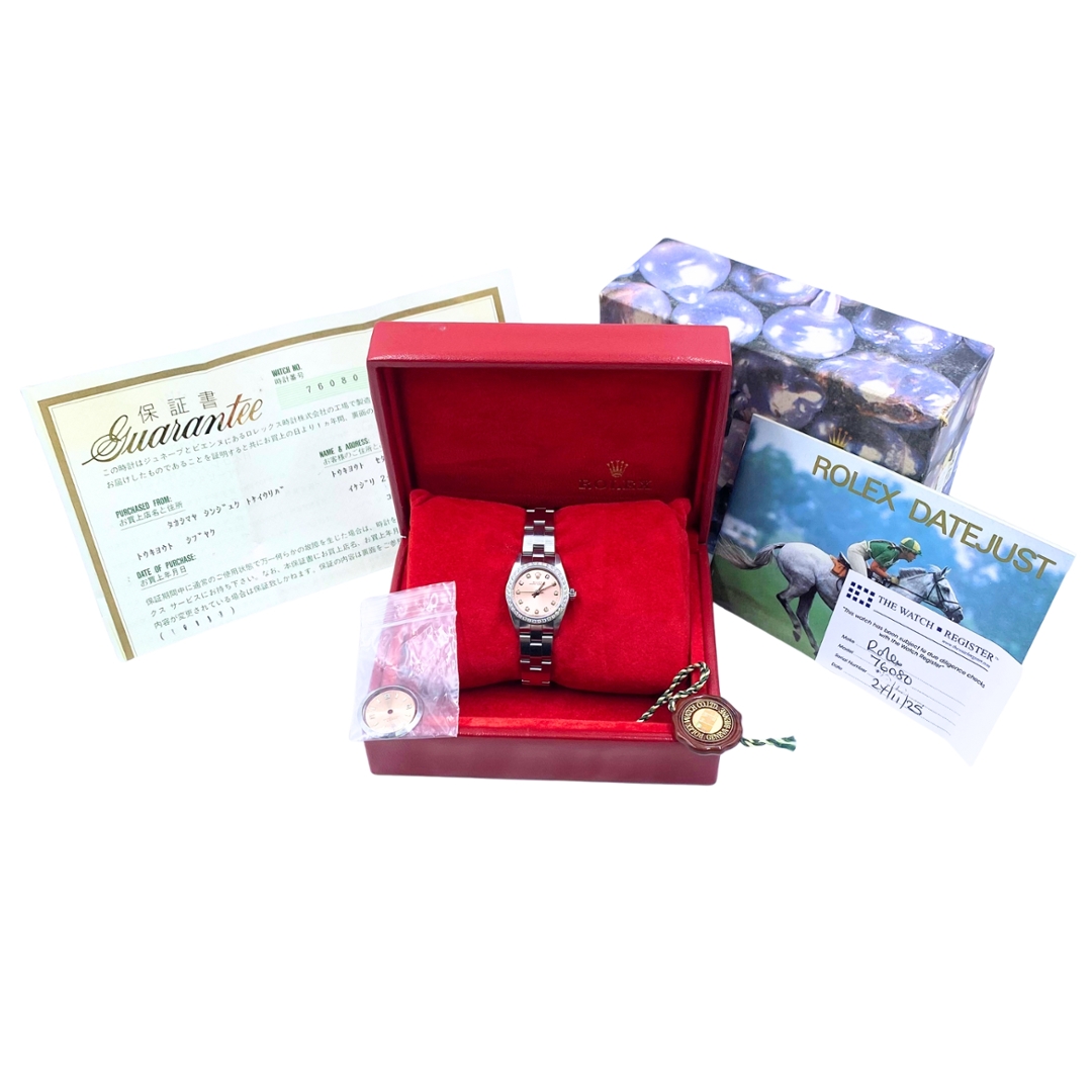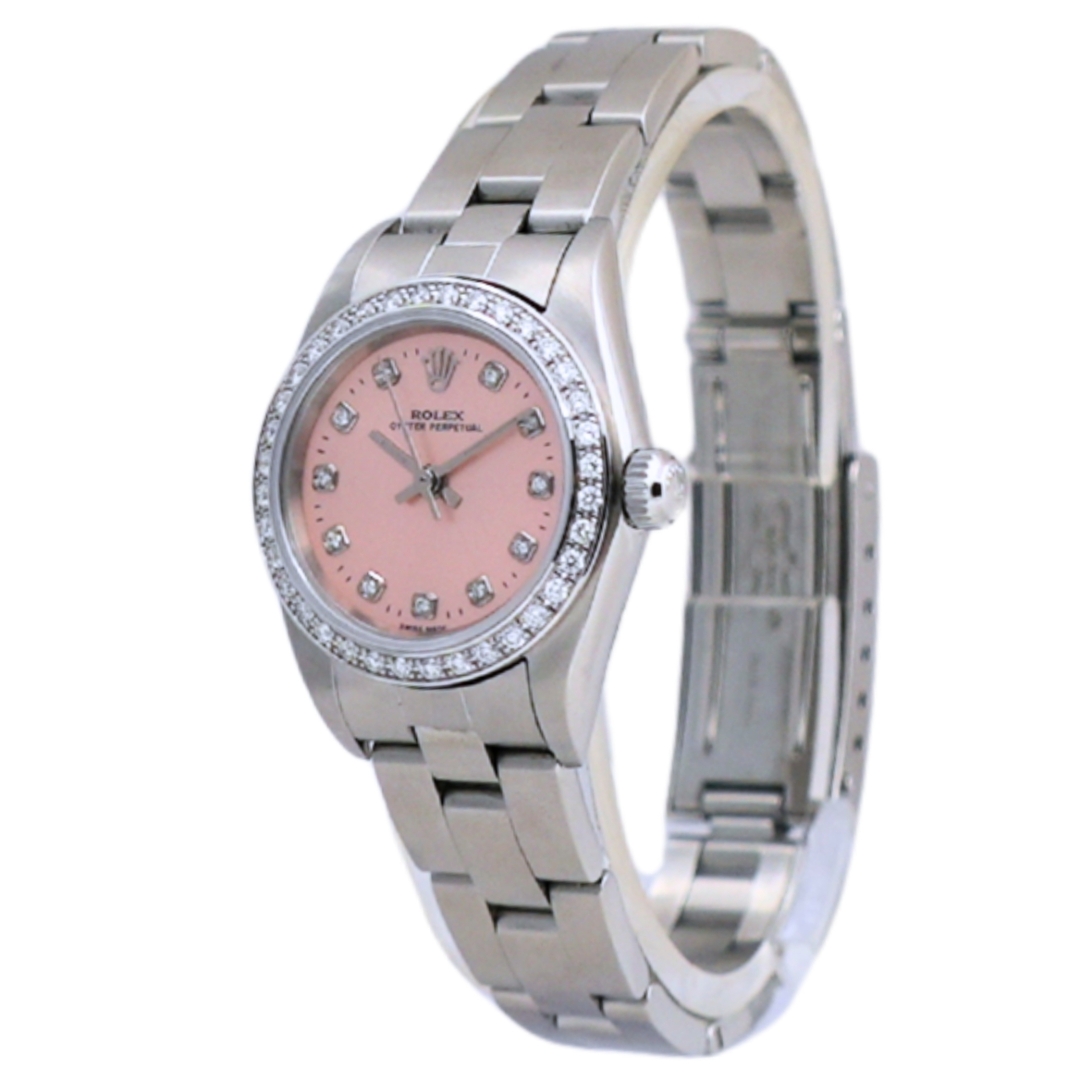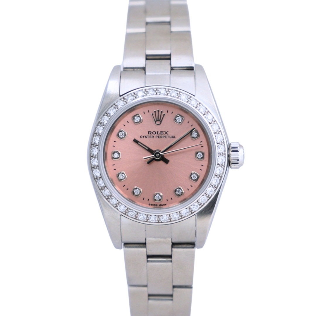 A Rolex Oyster Perpetual 76080, crafted in stainless steel and tastefully enhanced with an afterset diamond bezel and a rare salmon dial featuring afterset diamond numerals — a distinctive and elegant twist on a classic Rolex design. With a compact 24mm case, this model offers a refined, understated profile ideal for those who appreciate timeless style with a touch of individuality.