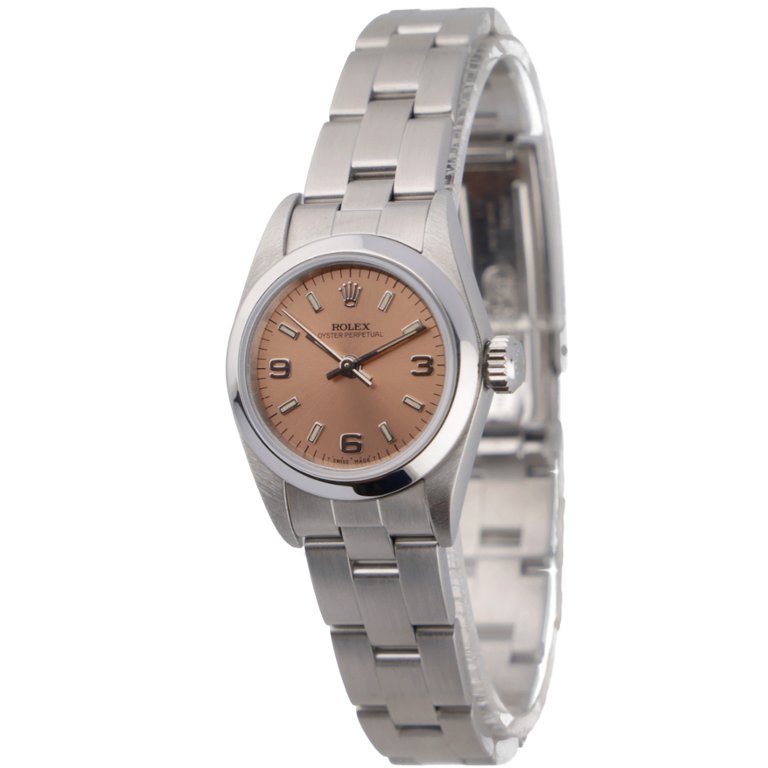 A Rolex Oyster Perpetual, model 67180, is presented in classic stainless steel with a compact 24mm case that offers both comfort and timeless versatility. The smooth bezel and Oyster bracelet create a clean, balanced aesthetic, allowing the standout salmon dial to take centre stage. Its warm tone adds a distinctive character rarely seen in this model, complemented by applied hour markers and Arabic numerals that enhance both charm and legibility.