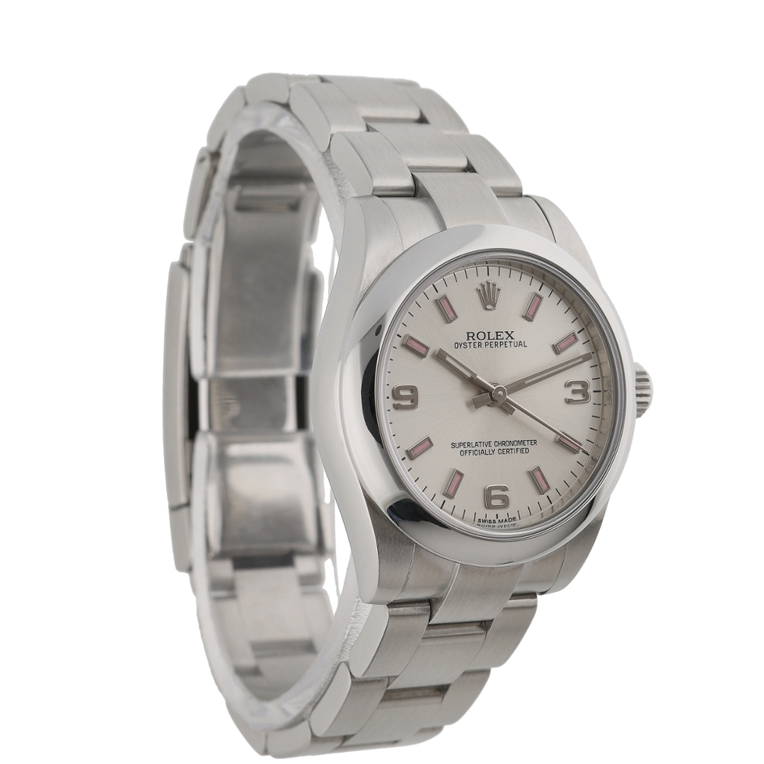 A Rolex Oyster Perpetual, model 177200, is presented in stainless steel with a well-proportioned 31mm case. The smooth bezel and Oyster bracelet create a clean, understated aesthetic, while the silver dial offers a refined and contemporary look. Subtle pink baton hour markers add a distinctive touch, giving the watch a unique character without compromising its timeless appeal.