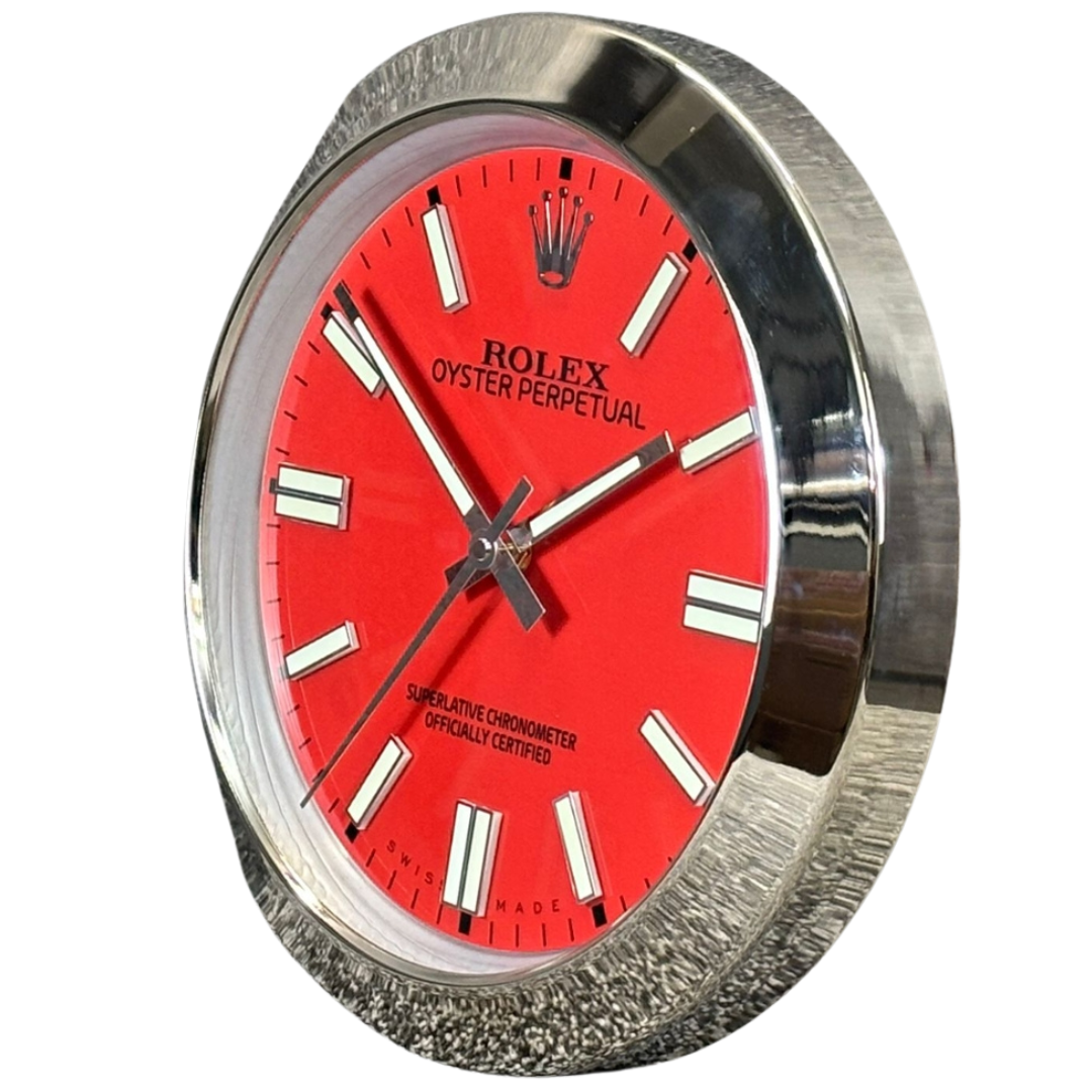 A stainless steel replica Rolex Oyster Perpetual wall clock, featuring a bold red dial that delivers a striking and contemporary take on a classic design. The clean, minimalist layout is complemented by baton-style hour markers and sleek hands, creating a strong visual presence while maintaining the timeless simplicity that defines the Oyster line.