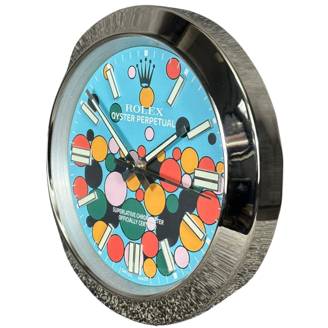 A stainless steel replica Rolex Oyster Perpetual wall clock, featuring the vibrant turquoise “Celebration” dial that delivers a playful and contemporary twist on a classic design. The bold turquoise base is brought to life with an array of colourful bubble-style accents, creating a unique and eye-catching aesthetic that stands out instantly while maintaining the unmistakable Rolex identity.