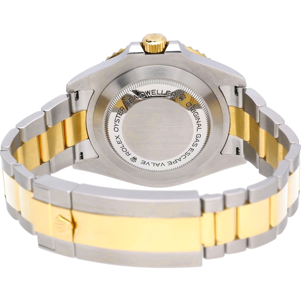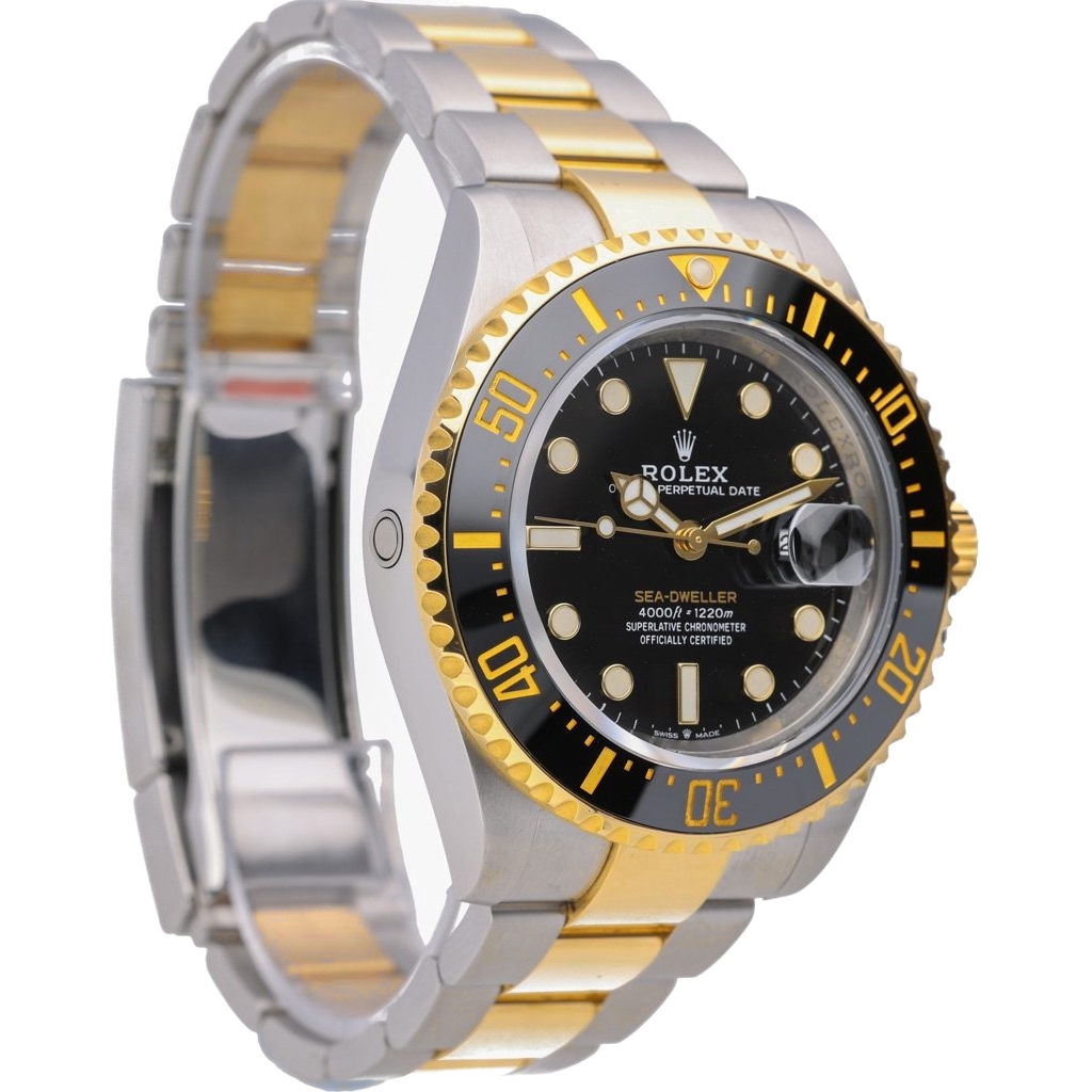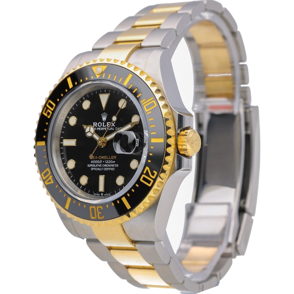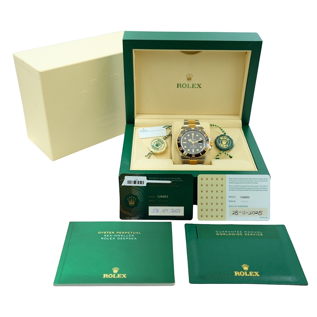 A Rolex Sea-Dweller reference 126603, crafted in stainless steel and 18ct yellow gold, presents a commanding and luxurious take on one of Rolex’s most capable professional dive watches. The 43mm case is paired with a black ceramic bezel and matching dial, accented by rich gold details that elevate its presence while retaining the unmistakable tool-watch identity.