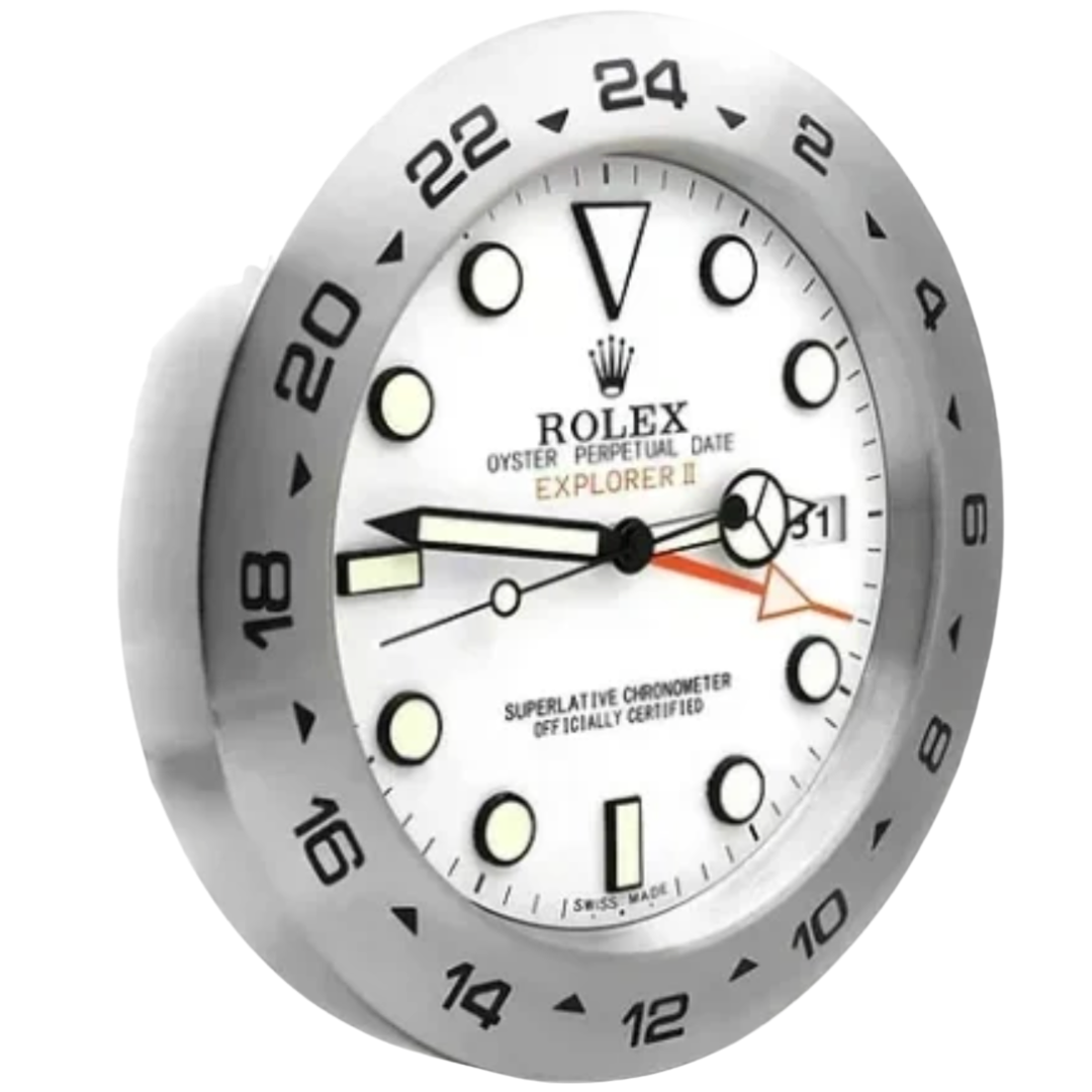 A stainless steel replica Rolex Explorer II wall clock, featuring a crisp white dial paired with a brushed steel bezel engraved with a 24-hour scale. Inspired by the iconic adventure-ready timepiece, this design showcases bold luminous-style hour markers, Mercedes hands, and the distinctive orange GMT hand, delivering a clean yet highly recognisable aesthetic that stands out in any setting.