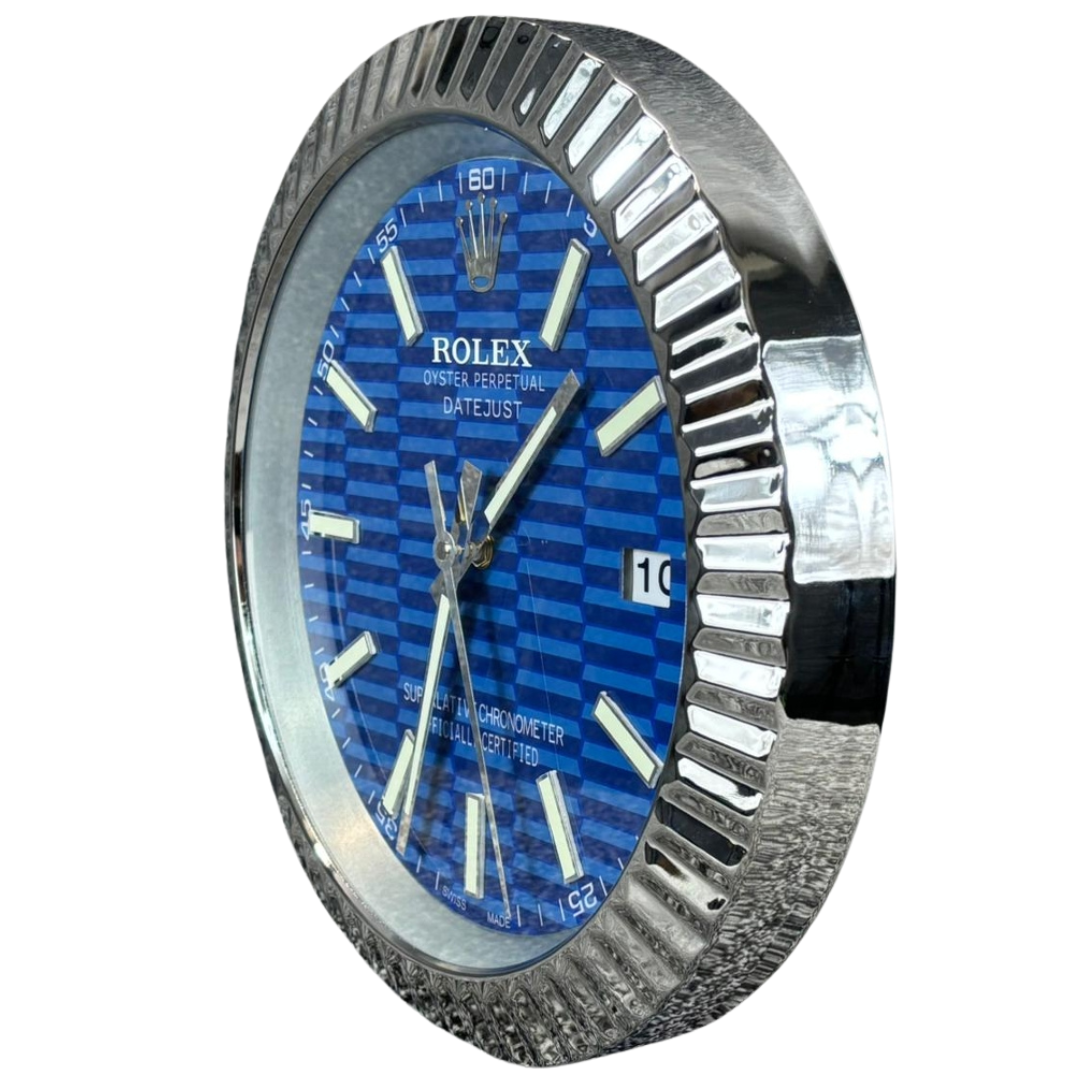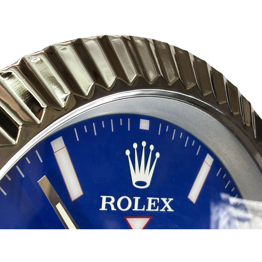 A stainless steel replica Rolex Sky-Dweller Wall Clock, a striking tribute to Rolex’s most advanced and travel-ready timepiece. Measuring approximately 14 inches in height and width, this bold wall clock features a captivating sunburst blue dial set within a gleaming silver-tone fluted bezel, echoing the prestige of the original.