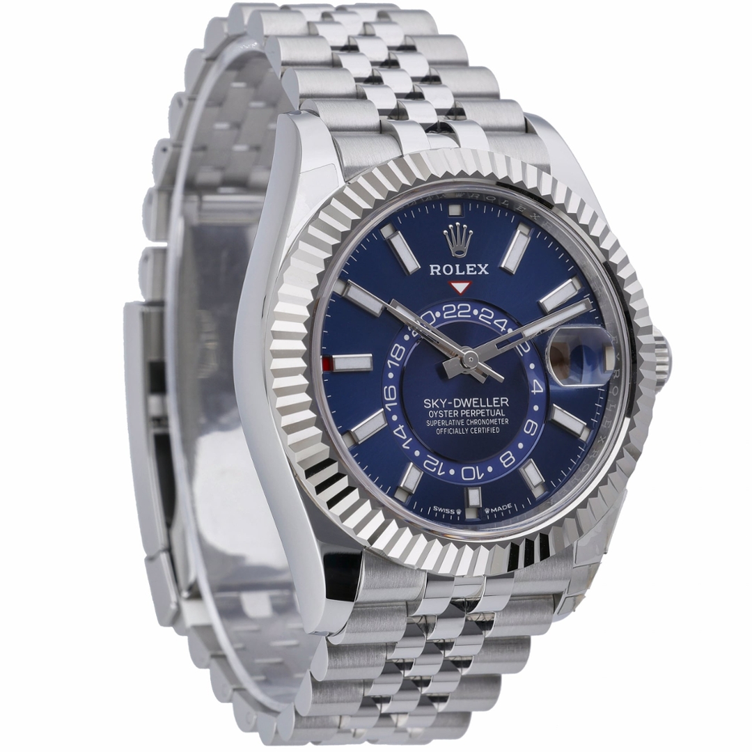 A Rolex Sky-Dweller 336934 from 2025 combines stainless steel with an 18ct white gold fluted bezel, framing a rich blue dial that enhances depth and legibility. The 42mm Oyster case provides strong wrist presence, while the dual-time display and annual calendar are arranged with clarity through the off-centre 24-hour ring and discreet month apertures. Chromalight hour markers further support readability in all lighting conditions.