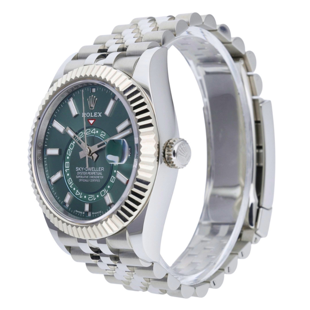 A Rolex Sky-Dweller 336934, presented in a 42mm Oyster case crafted from stainless steel with an 18ct white gold fluted bezel, representing one of Rolex’s most advanced and prestigious complications. The green sunburst dial delivers a bold and highly sought-after aesthetic, complemented by luminous baton hour markers and hands for exceptional legibility. The off-centre 24-hour disc enables dual time zone tracking, while the Cyclops lens at 3 o’clock magnifies the date, and the Ring Command bezel allows intuitive adjustment of the annual calendar and time functions.
