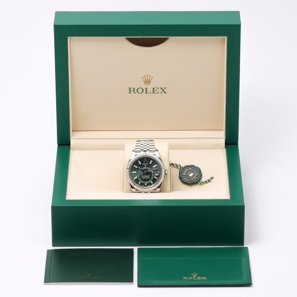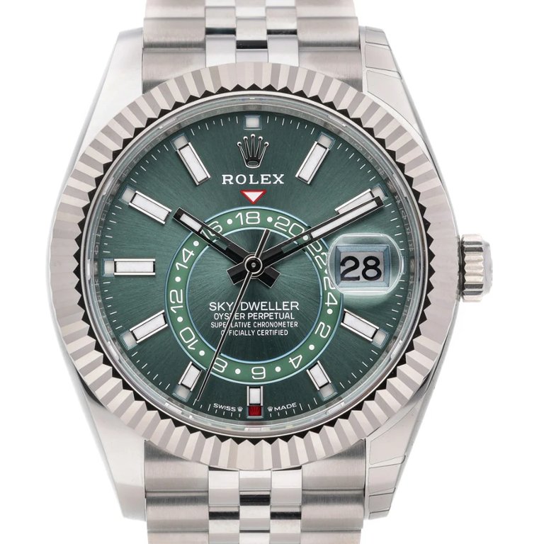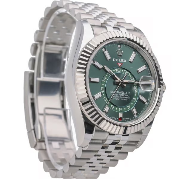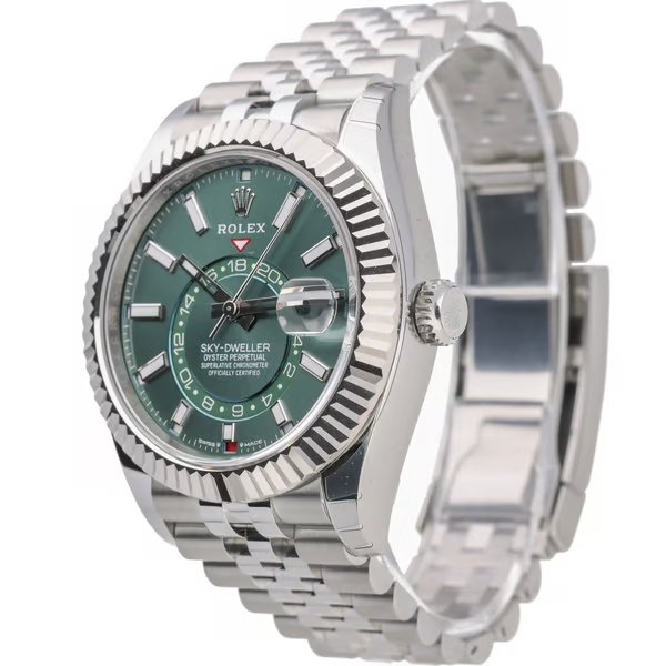 A Rolex Sky-Dweller 336934 presents a striking blend of stainless steel and 18ct white gold, centred around its distinctive green dial. The 42mm case offers a strong wrist presence, while the fluted white-gold bezel provides a refined contrast. The dual-time display and annual calendar are arranged with excellent clarity, supported by luminous hour markers and the signature off-centre 24-hour ring.