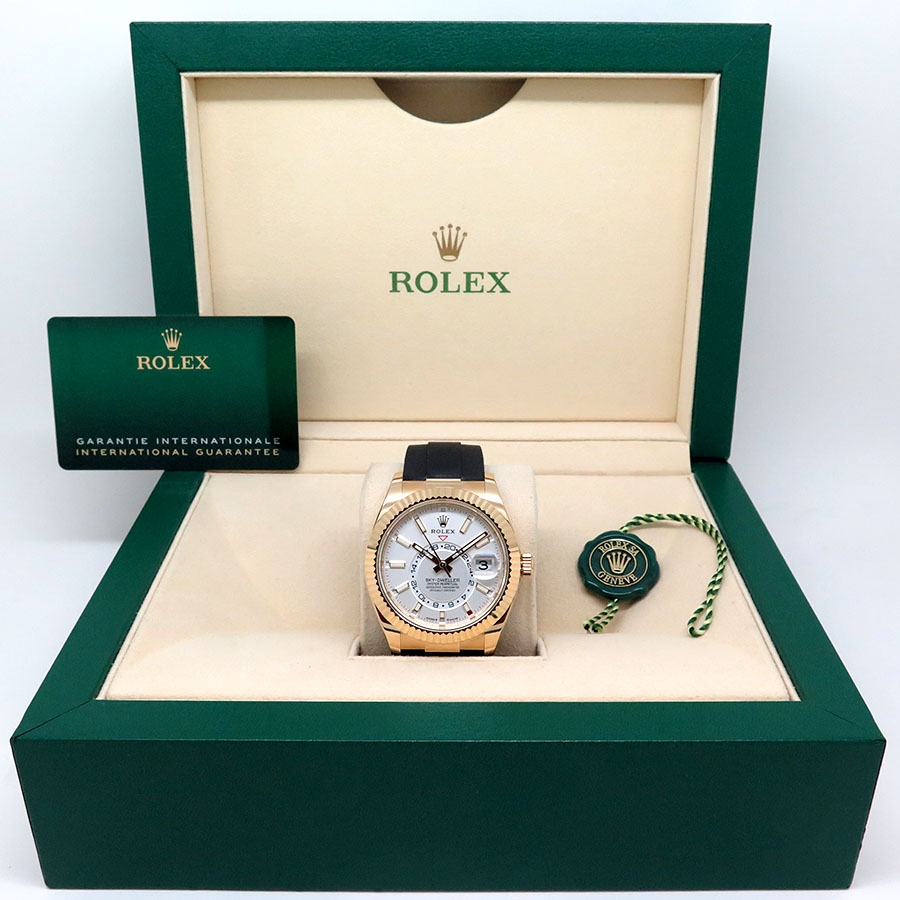 A Rolex Sky-Dweller 336238 is a testament to Rolex's unparalleled watchmaking mastery, blending sophistication, innovation, and timeless luxury. This extraordinary timepiece boasts a robust 42mm 18ct yellow-gold case and a matching yellow-gold bezel, exuding opulence from every angle. Its white dial, adorned with luminous hour markers and elegant gold accents, ensures effortless readability while maintaining a refined aesthetic. The durable yet stylish black Oysterflex rubber strap is secured with an 18ct yellow gold clasp, delivering a modern twist to this classic icon.