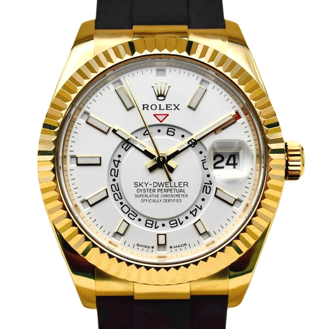 A Rolex Sky-Dweller Watch, Black Rubber Strap with an 18ct Yellow Gold Case & Clasp with an 18ct Yellow Gold Fluted Bezel on a White Dial