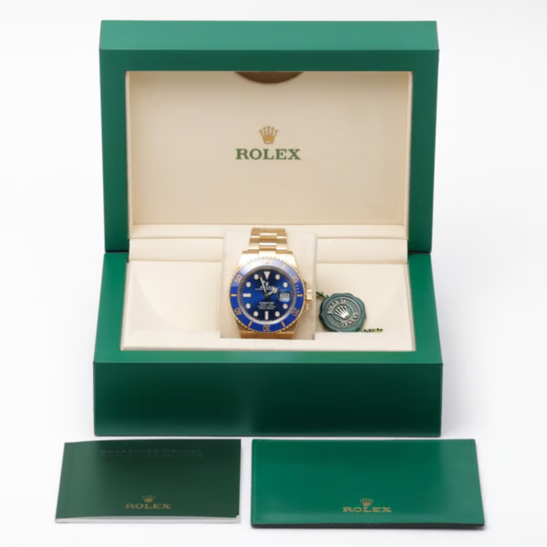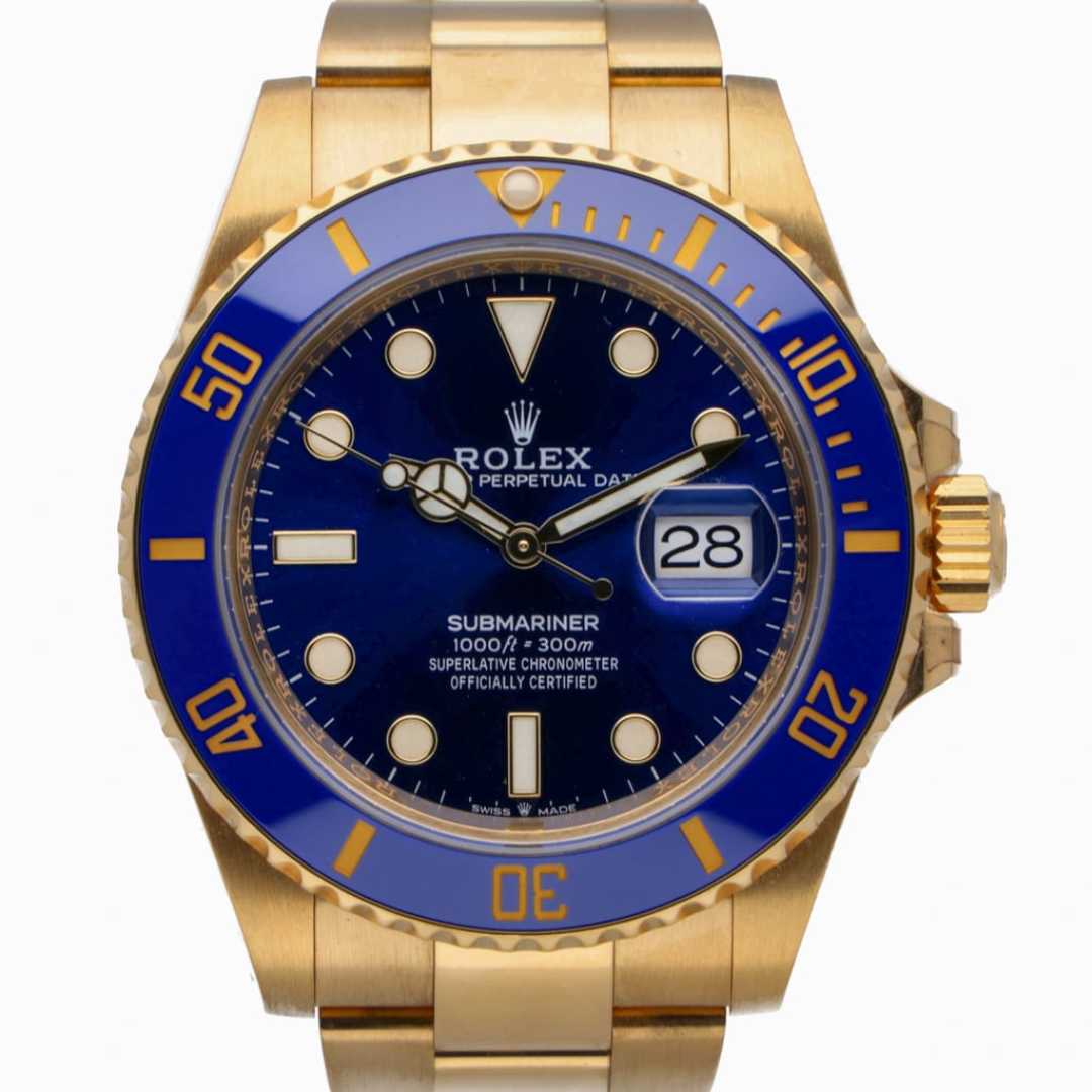 A Rolex Submariner watch in full 18ct yellow gold, featuring the unmistakable blue Cerachrom bezel and matching blue dial. This reference 126618LB represents the modern evolution of the classic gold Submariner, combining increased presence with refined proportions in the updated 41mm Oyster case. The luminous hour markers, Mercedes hands, and Cyclops date display deliver instant legibility while preserving the Submariner’s iconic tool-watch DNA.