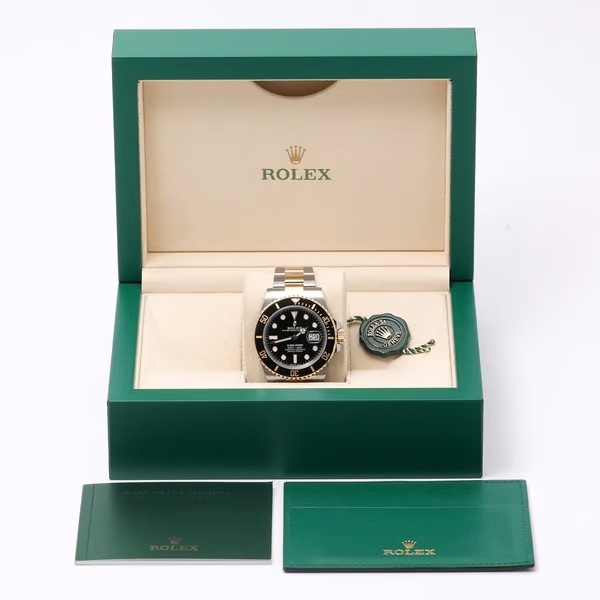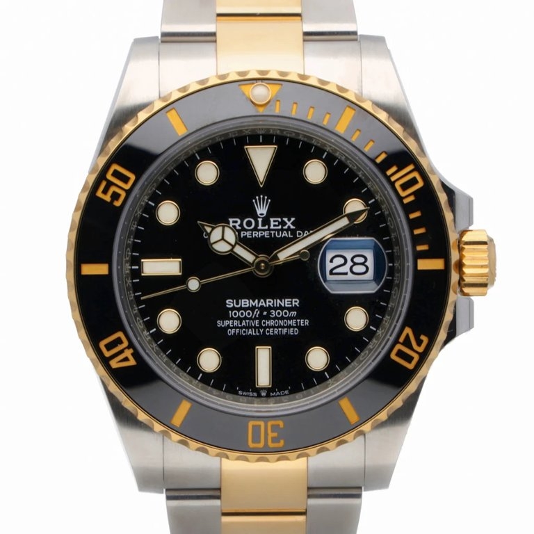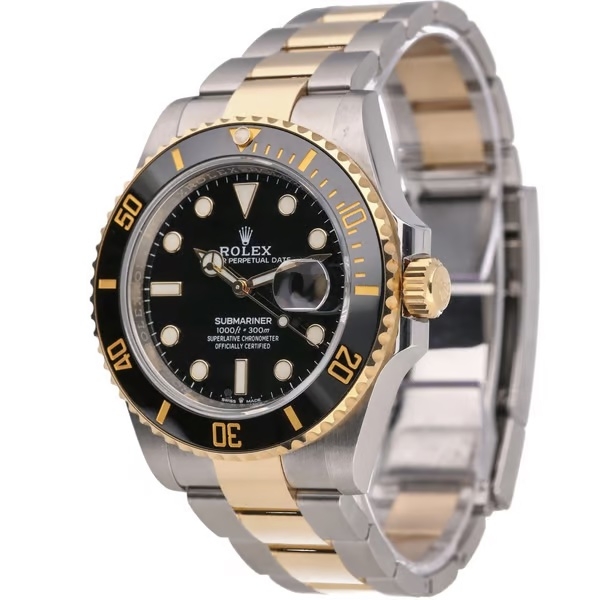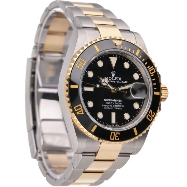 A bi-metal Rolex Submariner reference 126613LN, crafted in a combination of Oystersteel and 18ct yellow gold, featuring the signature black Cerachrom bezel and matching black dial. The 41mm case delivers the modern Submariner proportions, with luminous hour markers, Mercedes hands, and the unmistakable presence that defines Rolex’s most iconic professional dive watch.