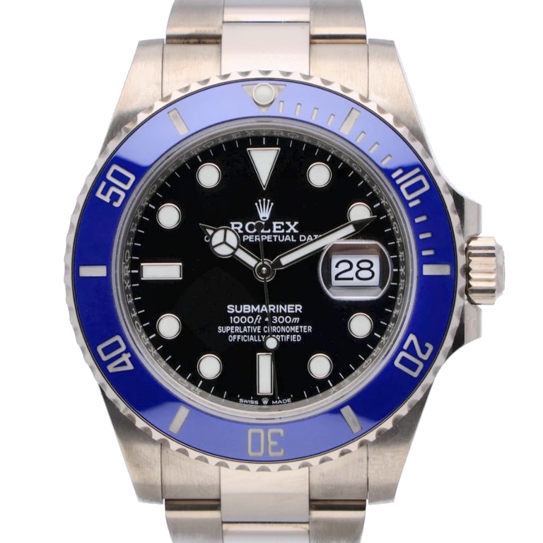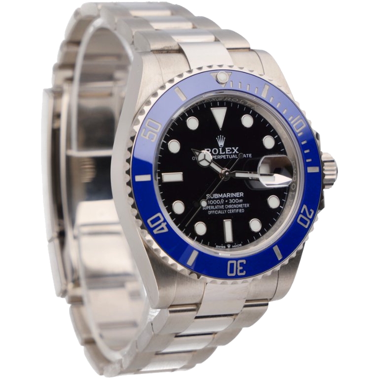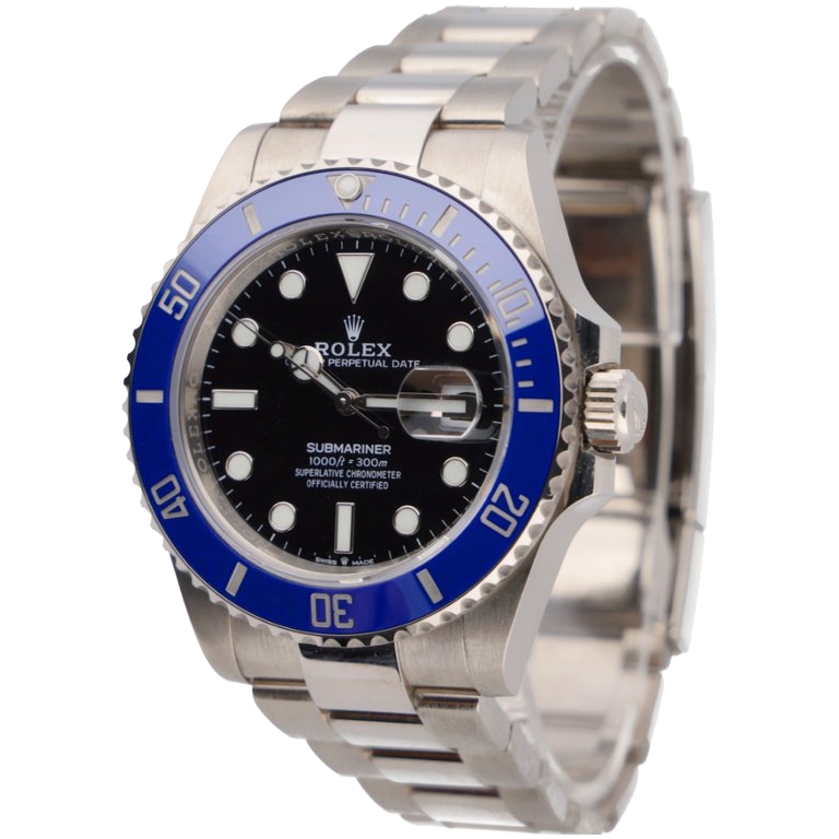 A Rolex Submariner reference 126619LB is crafted entirely from solid 18ct white gold and features a distinctive blue Cerachrom bezel and black dial, housed in the contemporary 41mm Oyster case. The contrast between the blue bezel and black dial gives this configuration a restrained, technical presence while clearly separating it from stainless steel Submariner references. Despite its precious metal construction, the watch retains the familiar proportions and wearability that define the modern Submariner line.