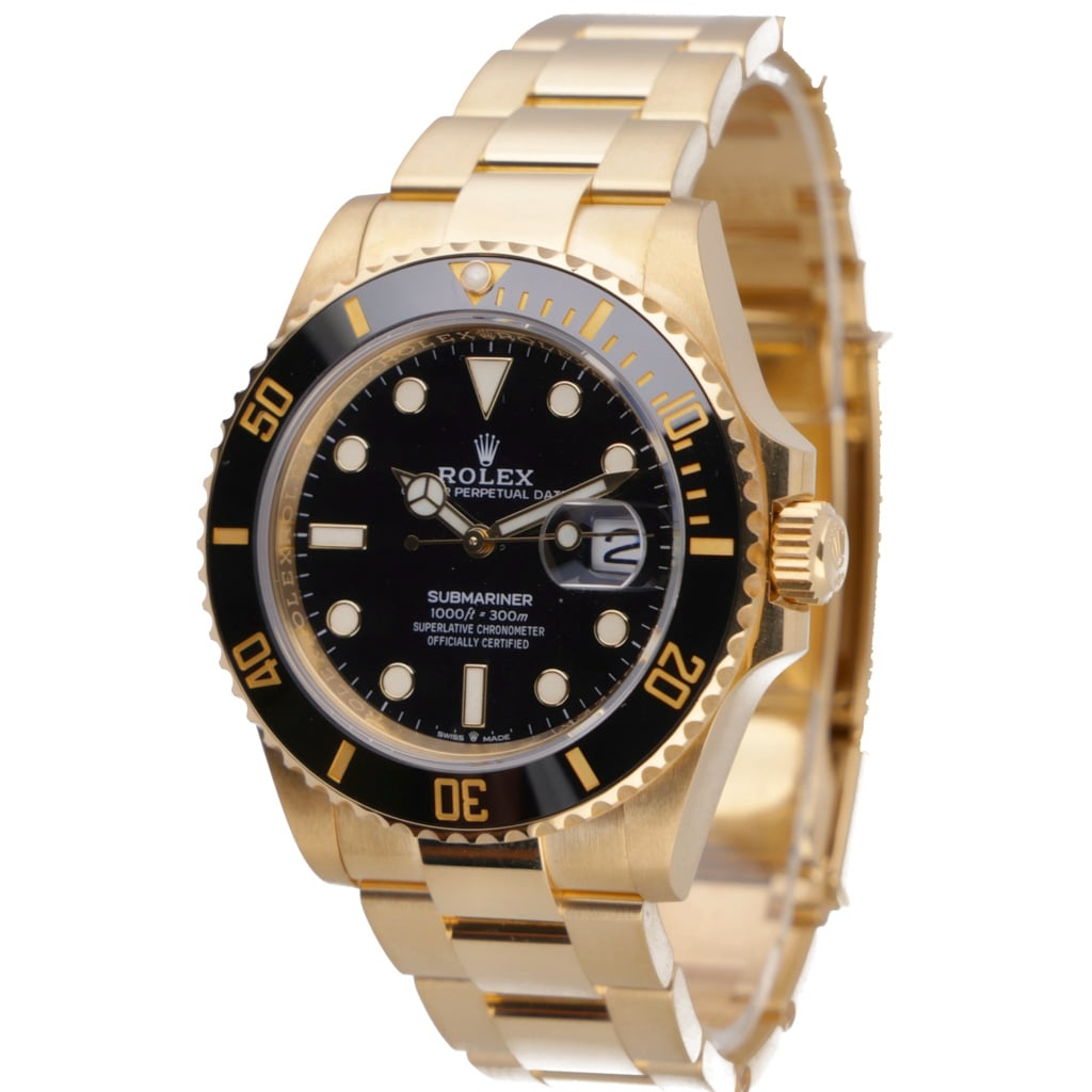 A Rolex Submariner reference 126618LN, crafted entirely in 18ct yellow gold and paired with a black dial and matching black Cerachrom bezel. The 41mm case represents the latest evolution of the Submariner, offering sharper proportions and a more refined wrist presence, while retaining the unmistakable DNA that has defined the model for decades. The contrast between solid-gold construction and the deep black dial creates a bold, high-impact aesthetic that immediately stands out.