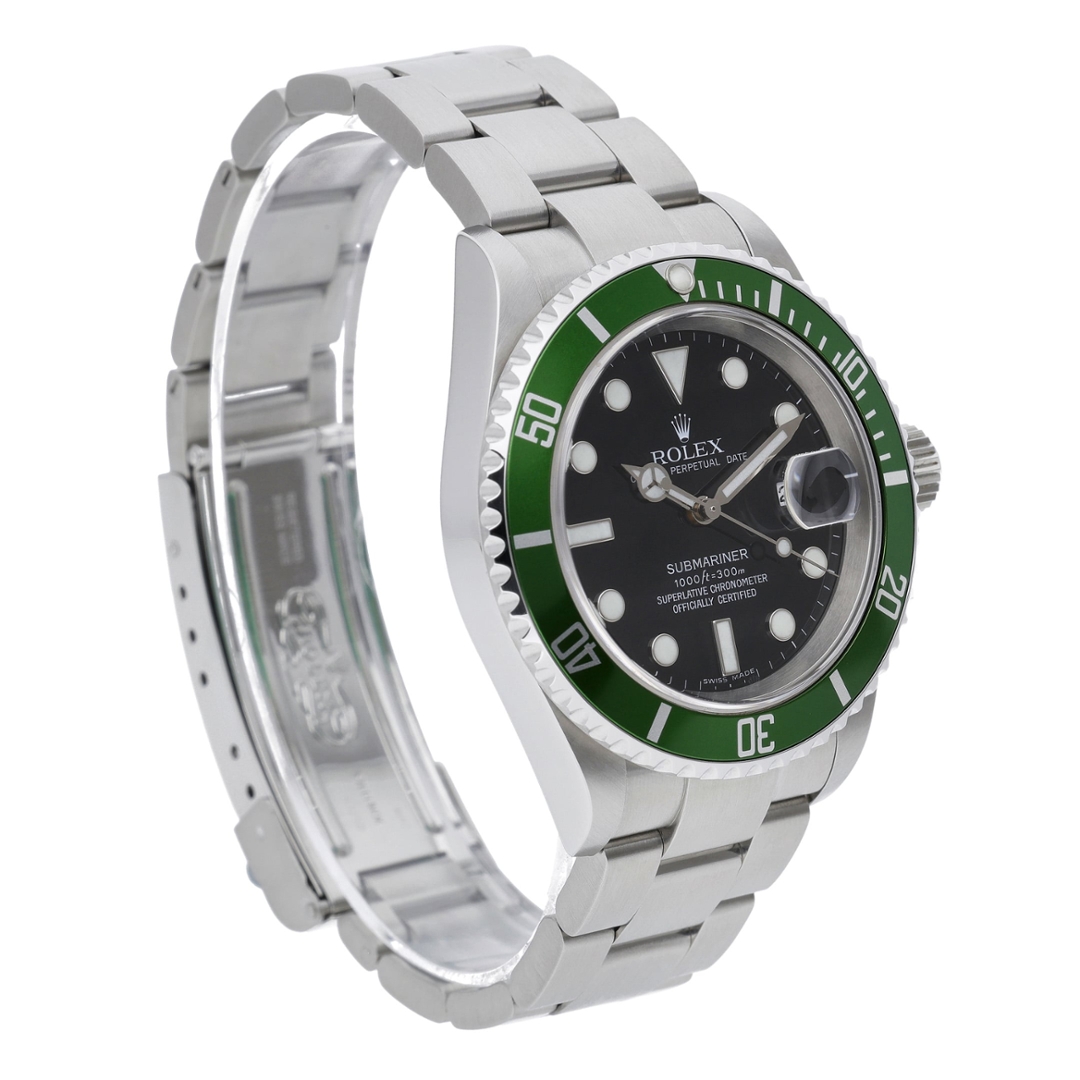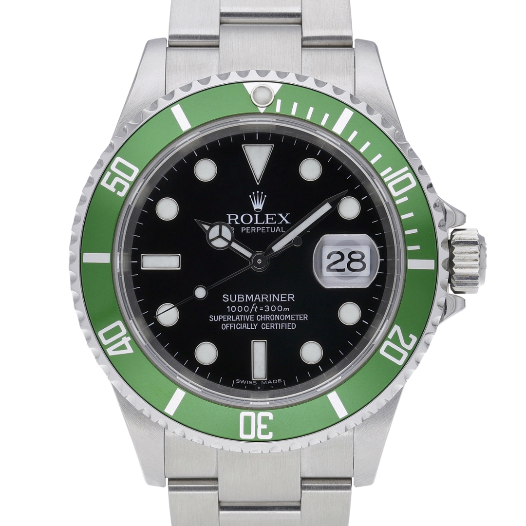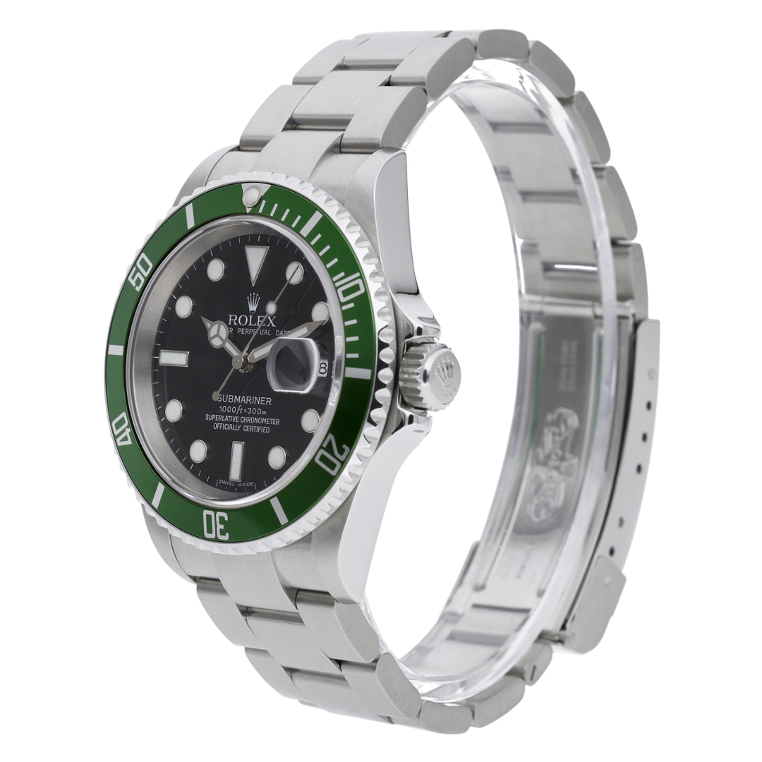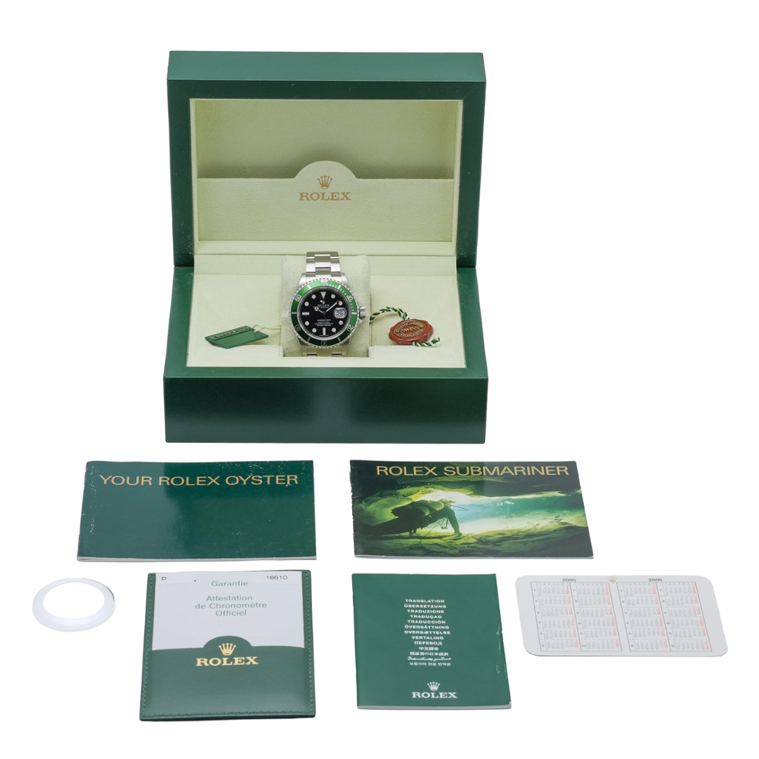 A Rolex Submariner reference 16610LV, presented in stainless steel with its iconic green aluminium bezel and classic black dial. Known as the “Kermit,” this anniversary model was introduced to celebrate 50 years of the Submariner, blending traditional proportions with a distinctive colourway that has become one of the most recognisable and collectible within the Rolex range.
