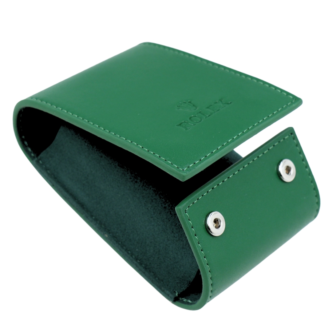 The Rolex travel case is the epitome of luxury and sophistication, designed for the discerning watch enthusiast. Crafted from premium materials, this case is enveloped in a rich, opulent green hue that immediately catches the eye. The front of the case proudly features the iconic Rolex logo, meticulously embossed to exude elegance and class.