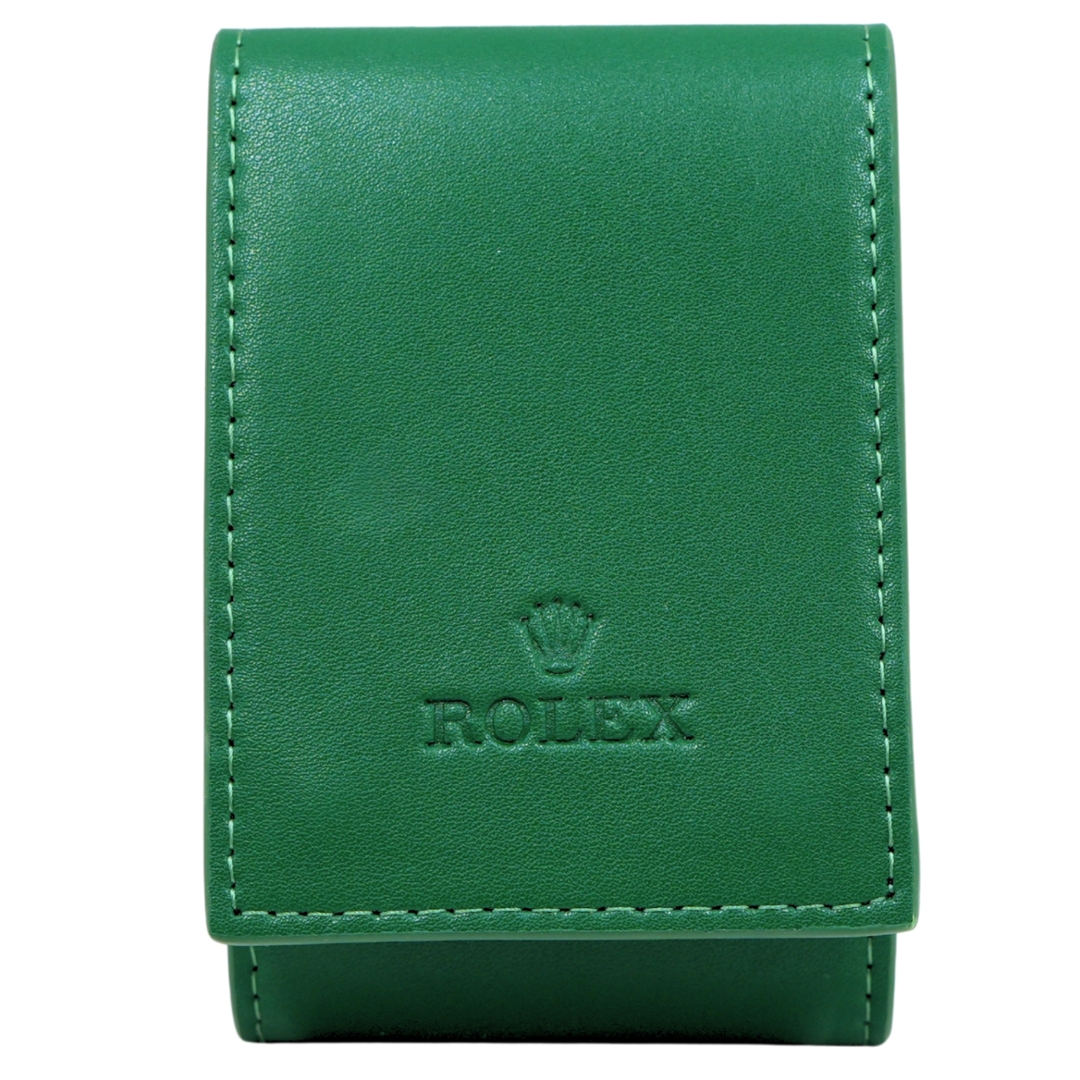 The Rolex travel case is the epitome of luxury and sophistication, designed for the discerning watch enthusiast. Crafted from premium materials, this case is enveloped in a rich, opulent green hue that immediately catches the eye. The front of the case proudly features the iconic Rolex logo, meticulously embossed to exude elegance and class.
