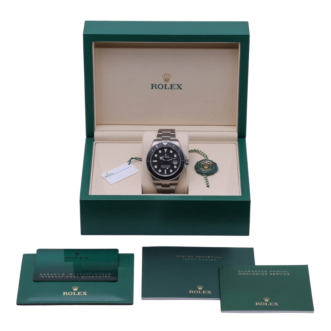 A Rolex Yacht-Master 42 226627 from 2025, presented in immaculate condition and supplied as a complete set with its box, paperwork, and Rolex warranty valid until 2030. Crafted from RLX titanium, it offers exceptional lightness while maintaining the durability and presence expected of the Yacht-Master line. The matte-black Cerachrom bezel pairs seamlessly with the intense-black dial to create a striking, modern aesthetic.