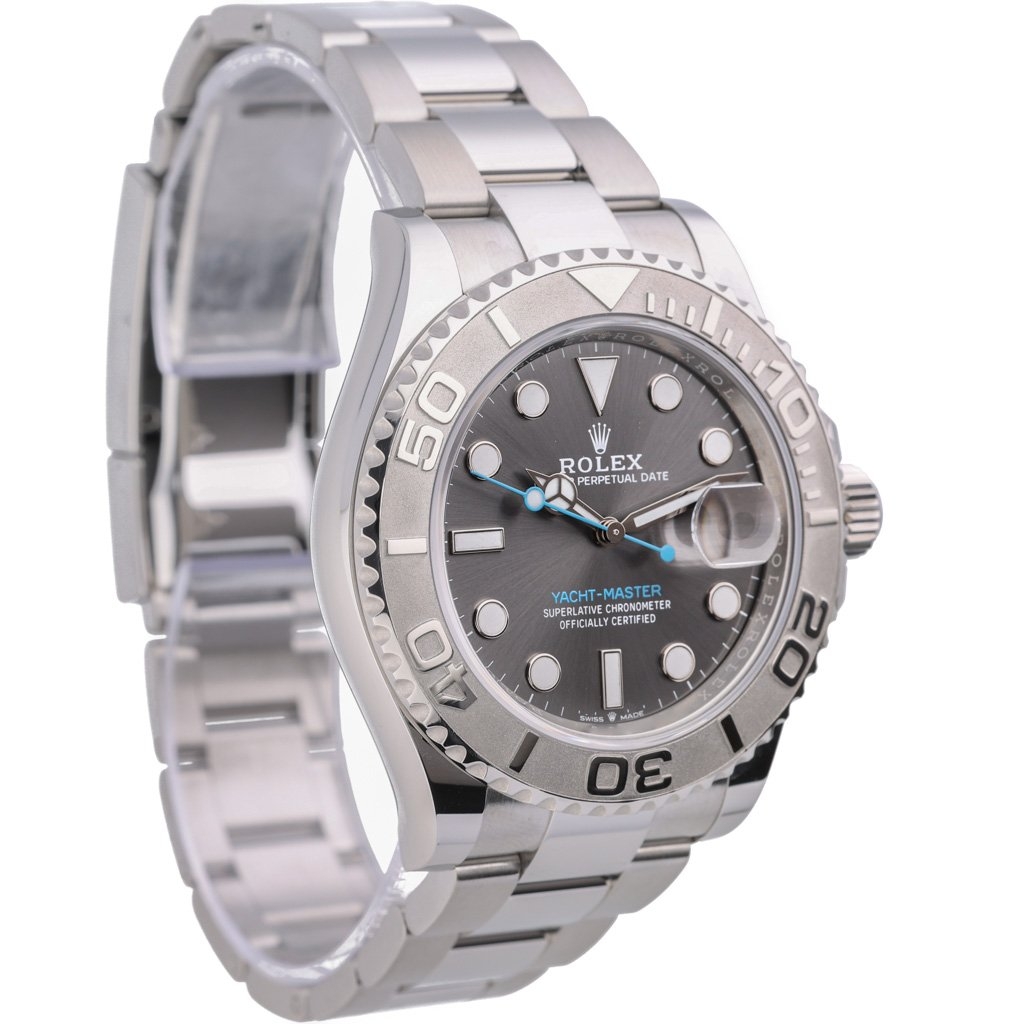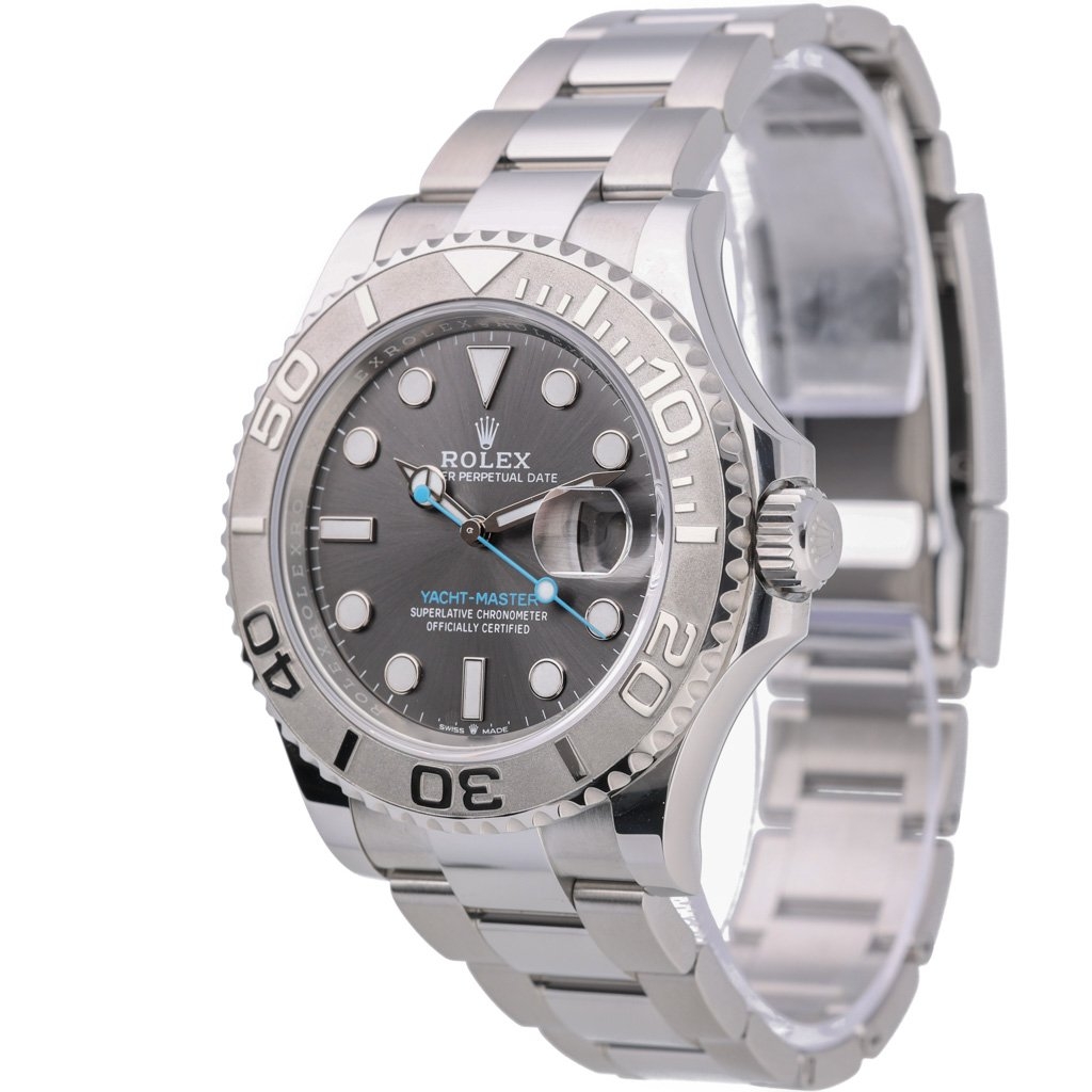 This Rolex Yacht-Master 40 reference 126622 pairs a stainless steel Oyster case with a solid platinum bidirectional bezel, delivering a refined yet purpose-built aesthetic. The slate dial, often referred to as rhodium, features crisp luminous hour markers and the distinctive turquoise seconds hand that defines the modern Yacht-Master line. At 40mm, the case offers balanced proportions that sit comfortably on the wrist while retaining a strong nautical presence.