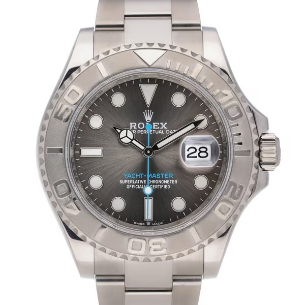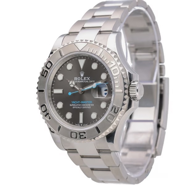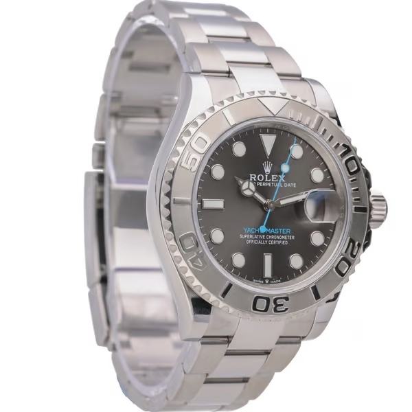 A Rolex Yacht-Master reference 126622 in stainless steel, paired with a platinum bidirectional bezel and a 40mm Oyster case that delivers both presence and versatility. The rhodium dial offers a refined, monochromatic aesthetic, elevated by contrasting luminous hour markers and the signature blue seconds hand and text, creating a distinctive and recognisable Yacht-Master profile.