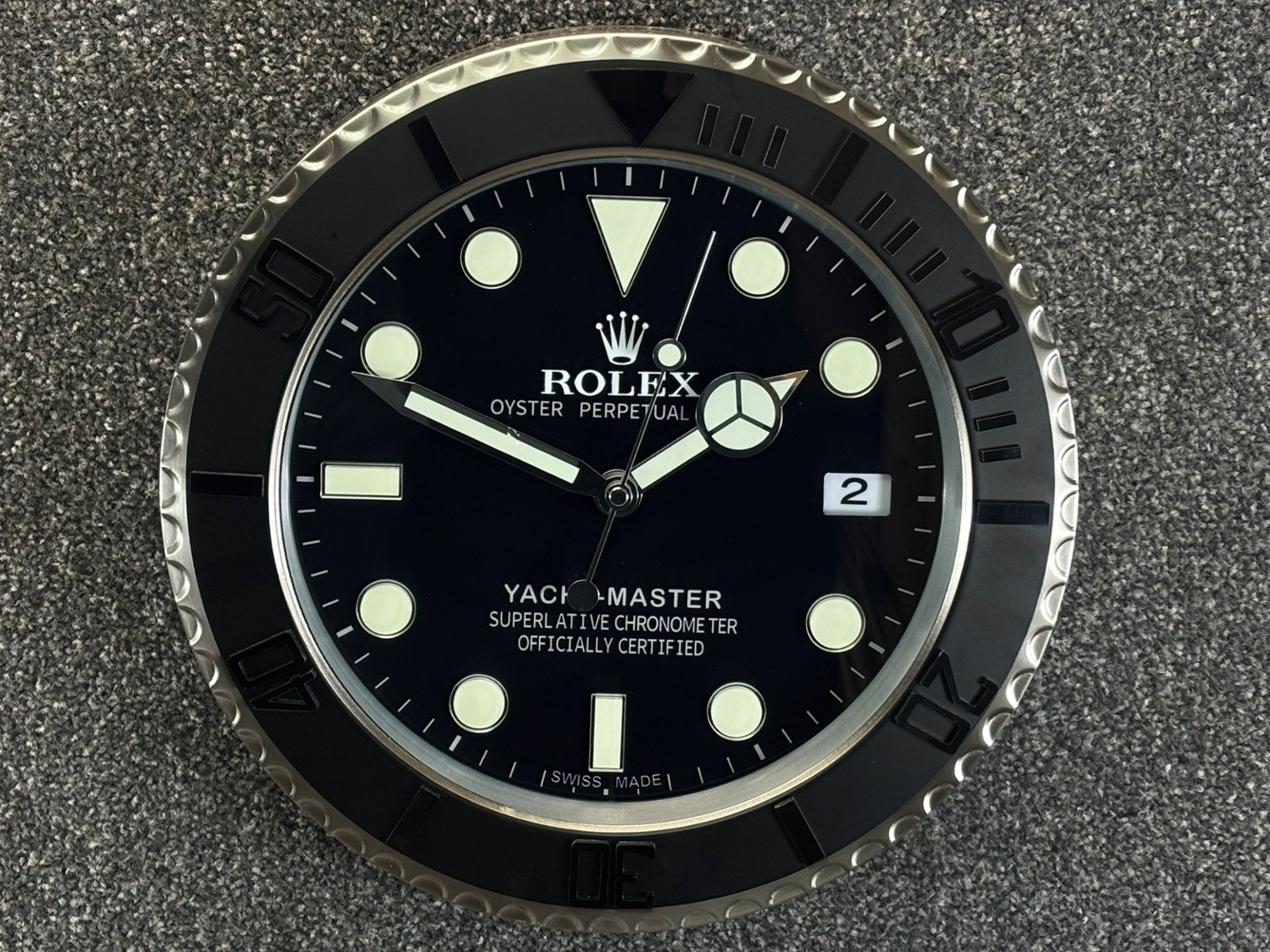 A stainless steel replica Rolex Yacht-Master Wall Clock in a classic black and silver finish. Measuring approximately 14 inches in height and width, this commanding timepiece channels the seafaring spirit of one of Rolex’s most iconic nautical designs.