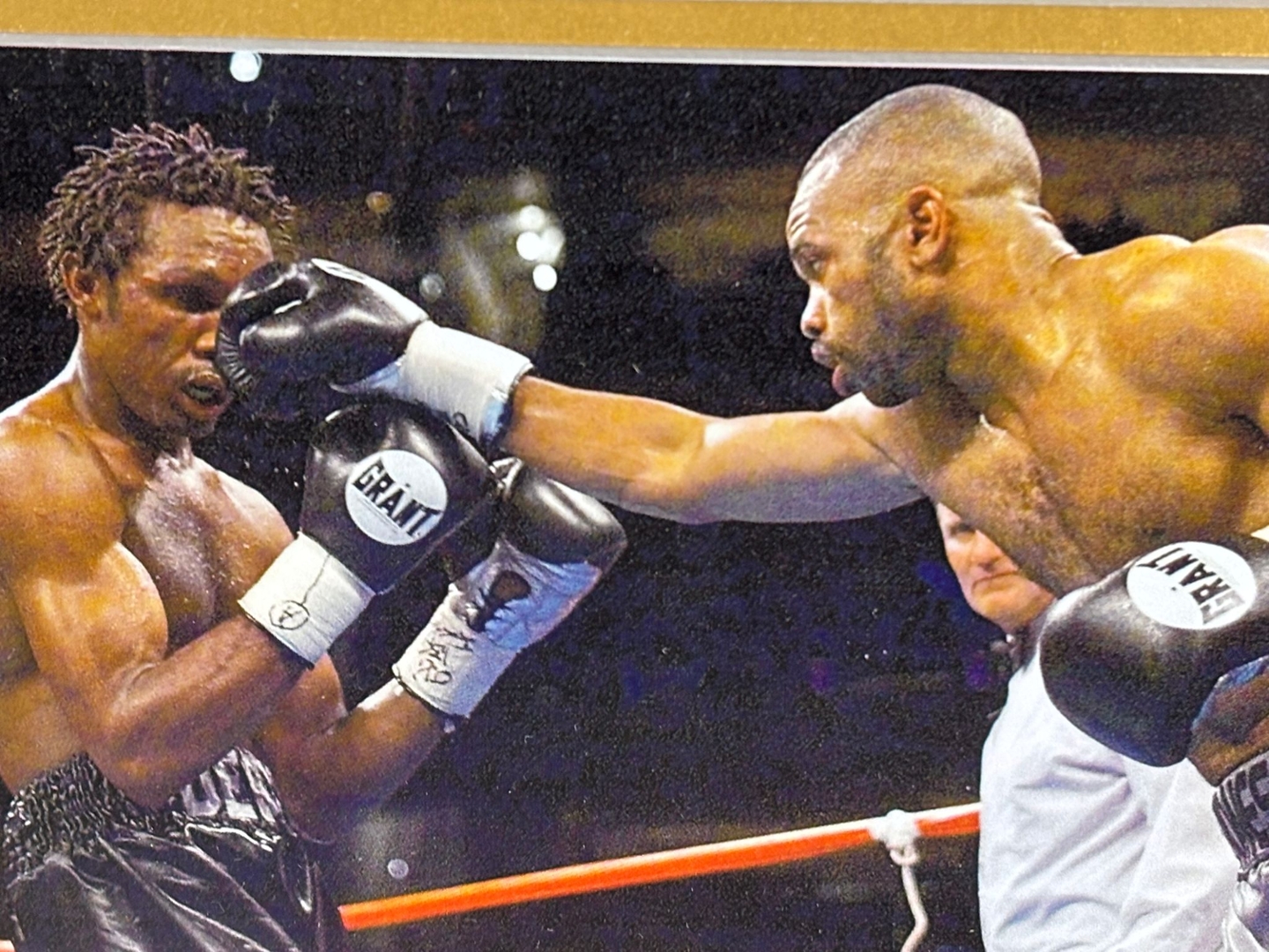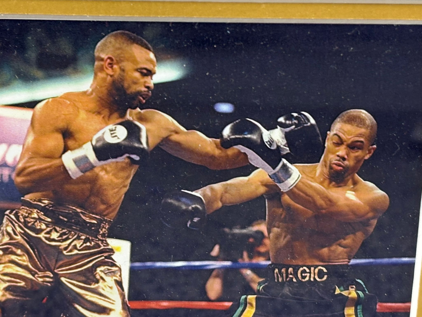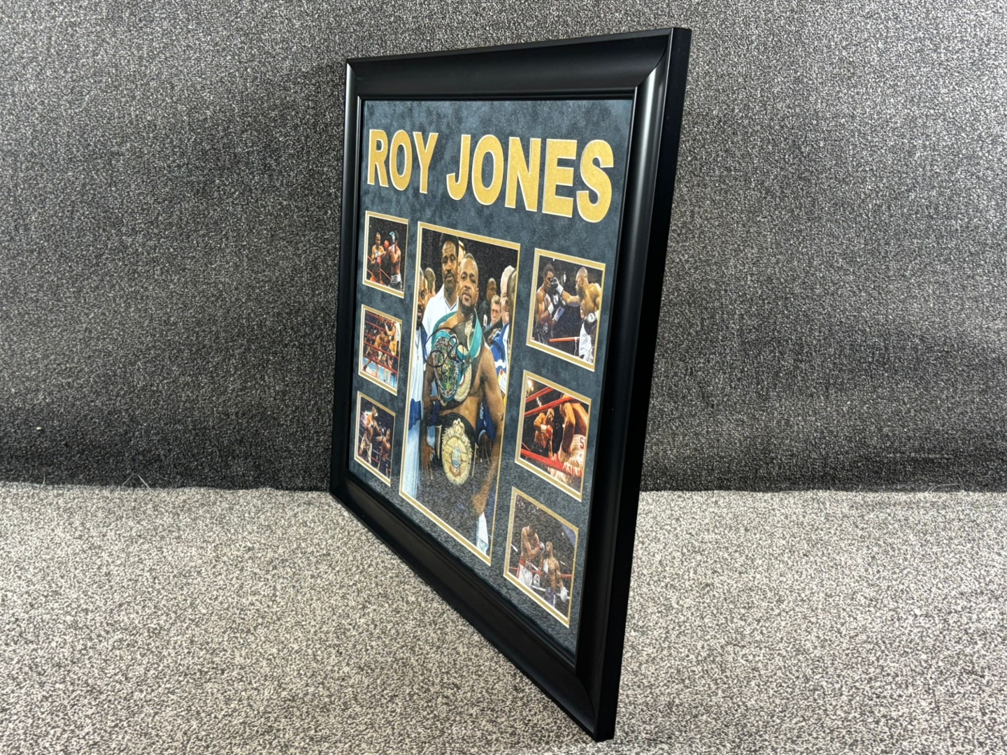 Roy Jones Jr’s autograph, clearly signed across the central image, adds authenticity and collector prestige to this one-of-a-kind montage. Elegantly framed with gold accents and bold ROY JONES lettering across the top, this piece is both a tribute and a statement. A knockout centrepiece for any fan of boxing history and greatness.