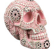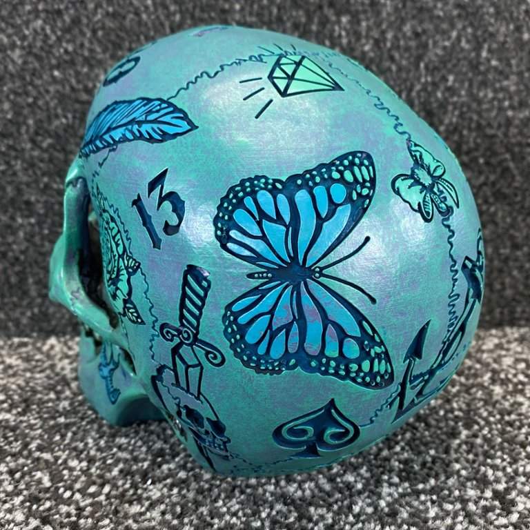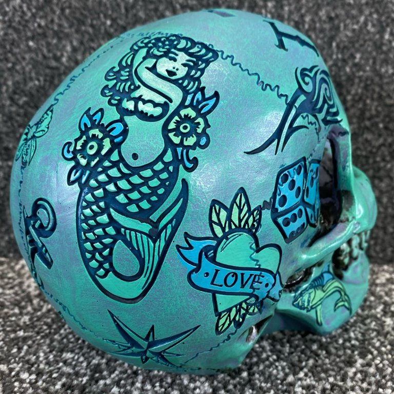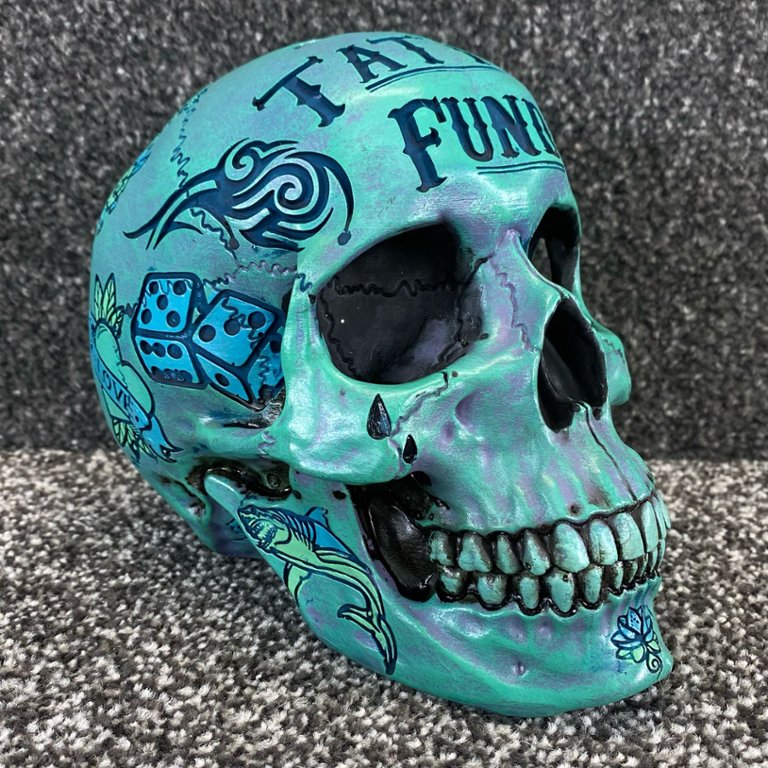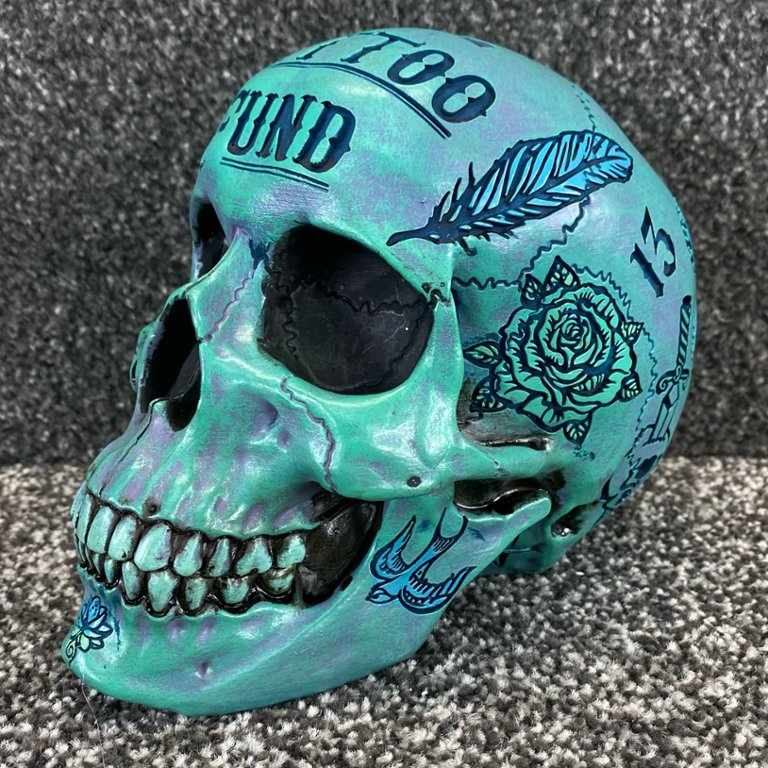 Crafted with meticulous attention to detail, the sculpture features a stylized skull adorned with intricate blue tattoo designs, adding a pop of colour and personality to its rugged exterior. From delicate linework to bold motifs, every aspect of the design exudes a sense of individuality and self-expression.