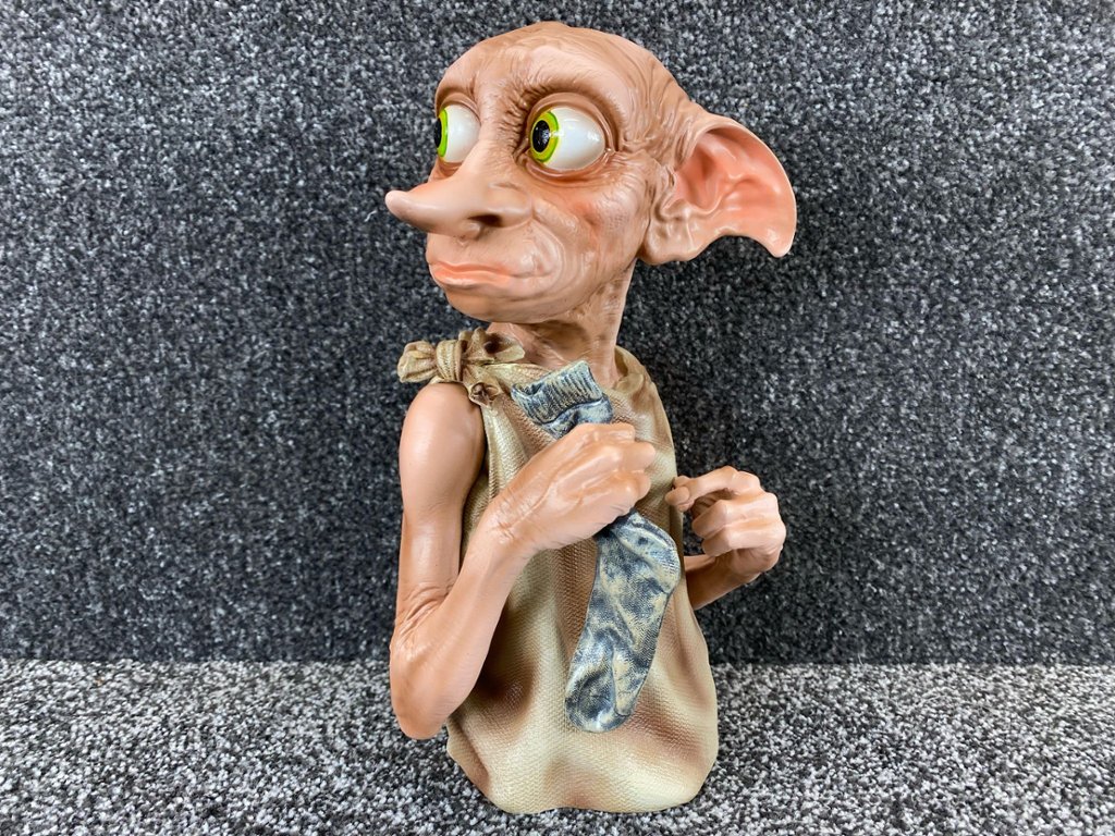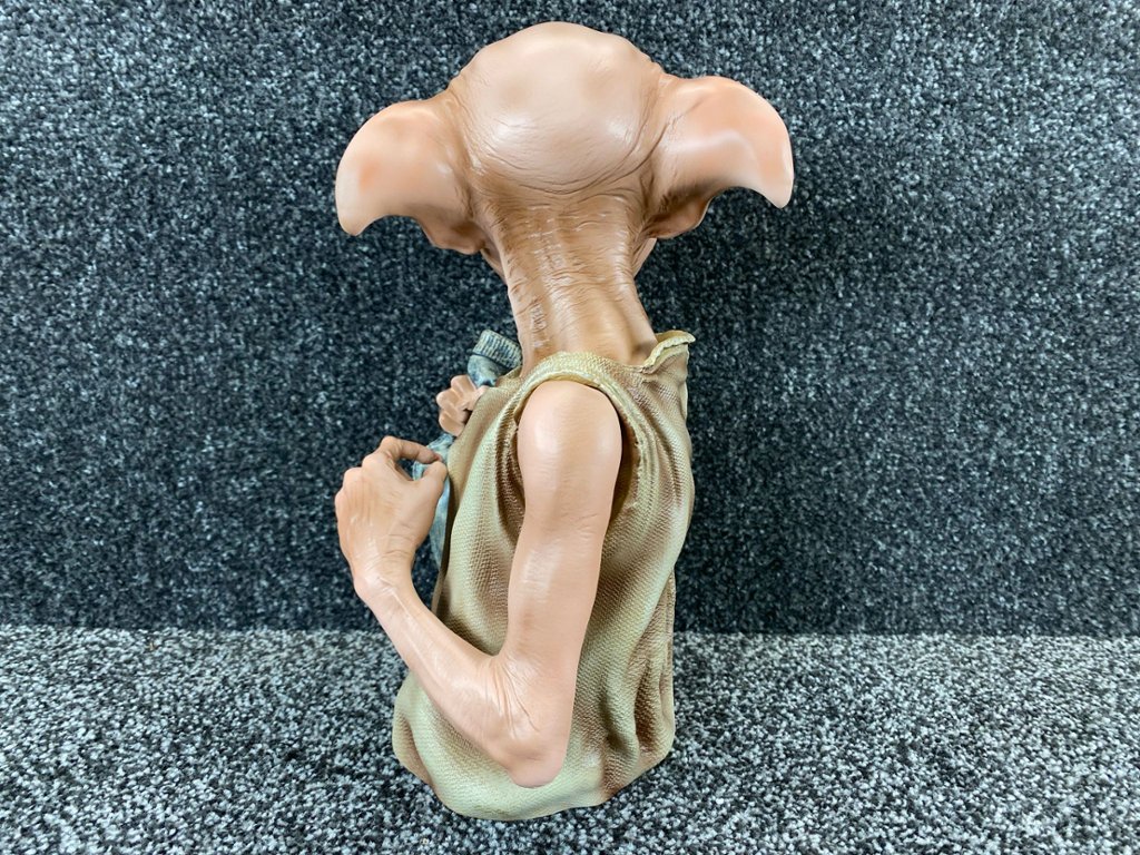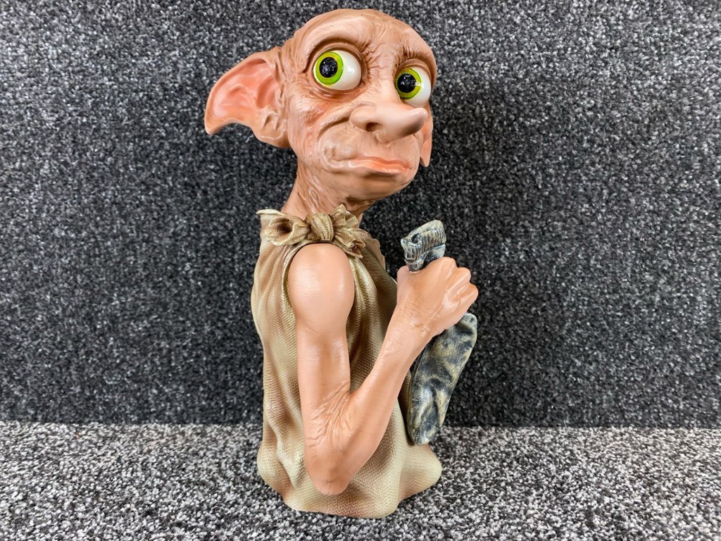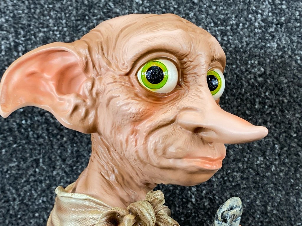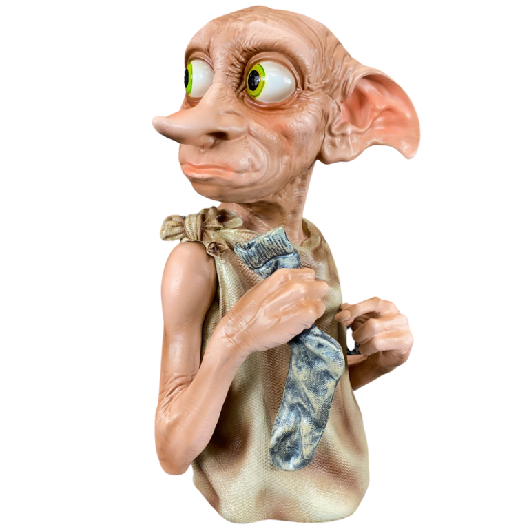 At its core, the bust features the unmistakable likeness of Dobby, the loyal and courageous house-elf, portrayed with his signature large, expressive eyes and oversized ears. Every aspect of Dobby's appearance, from the intricate wrinkles in his clothing to the mischievous twinkle in his eye, is faithfully reproduced to evoke the whimsical charm of the beloved character.
