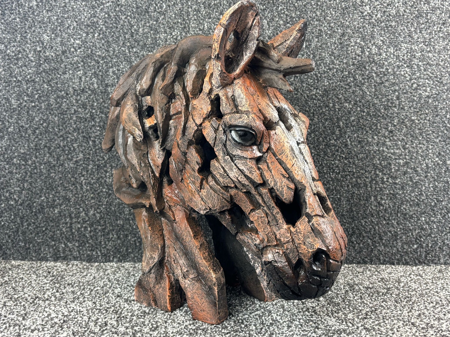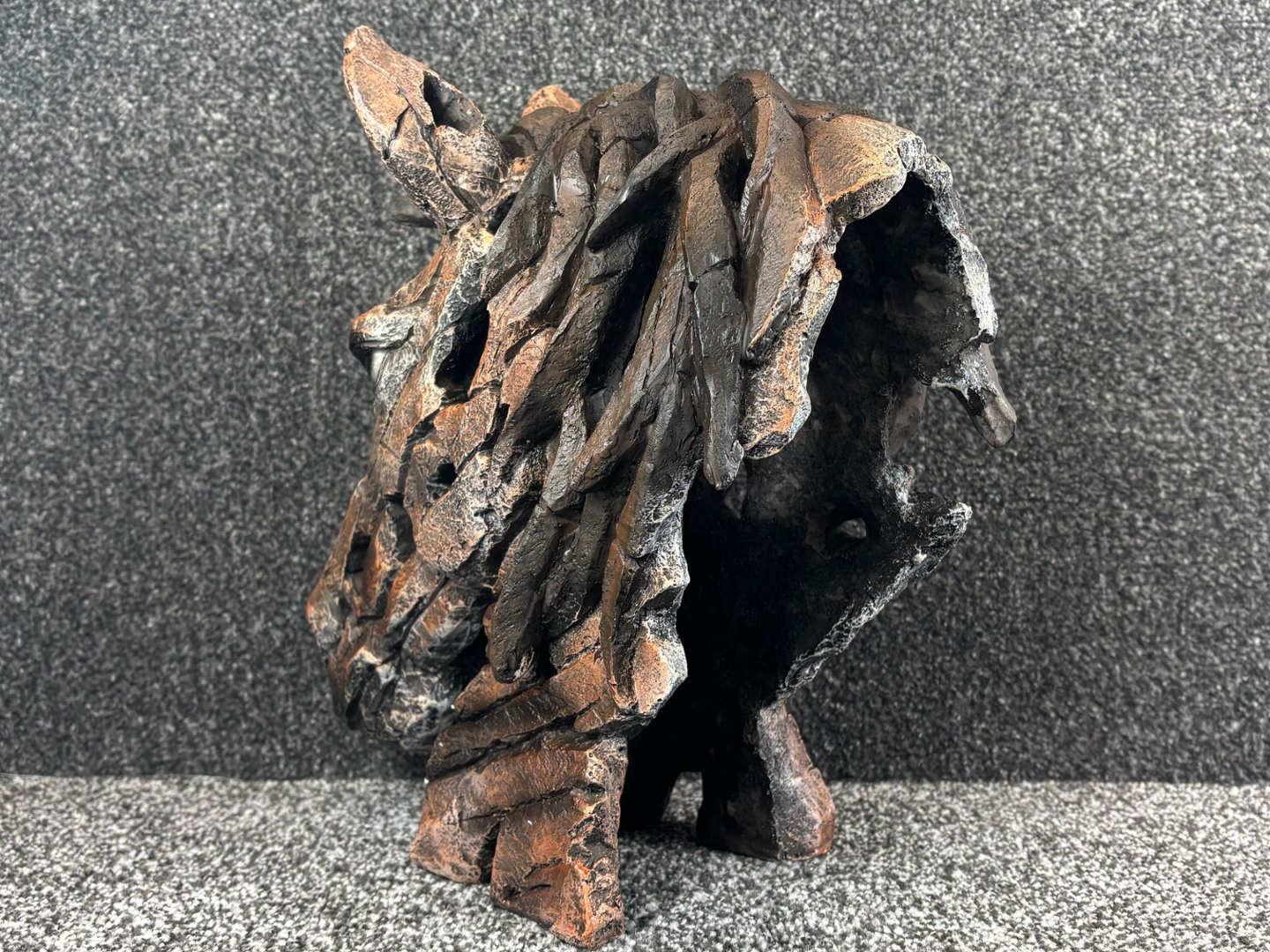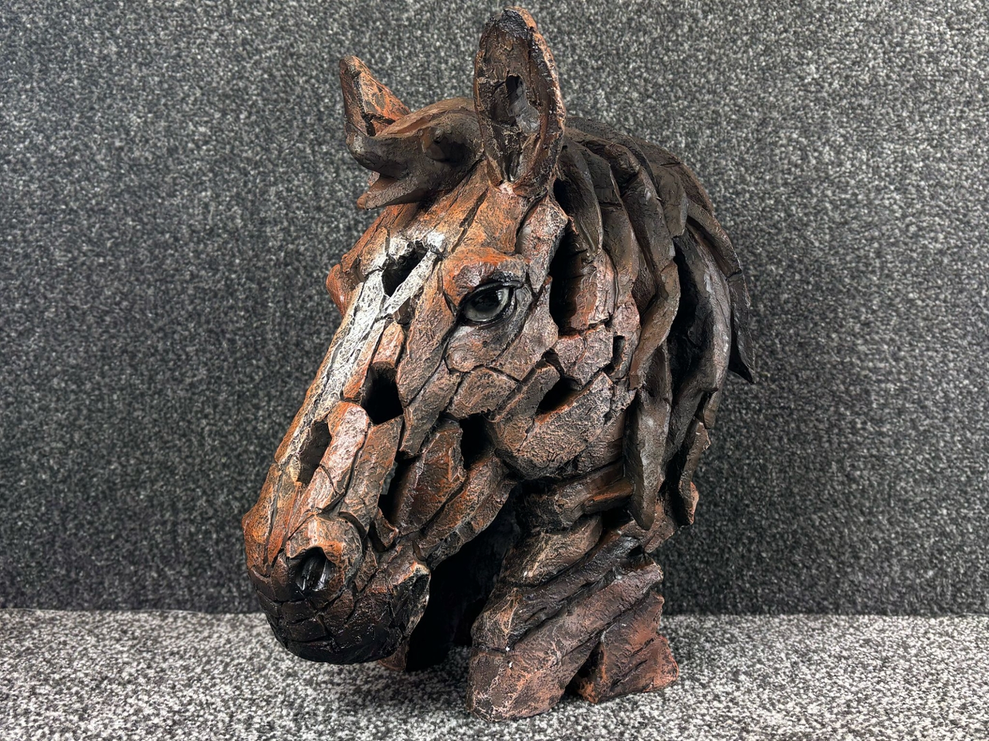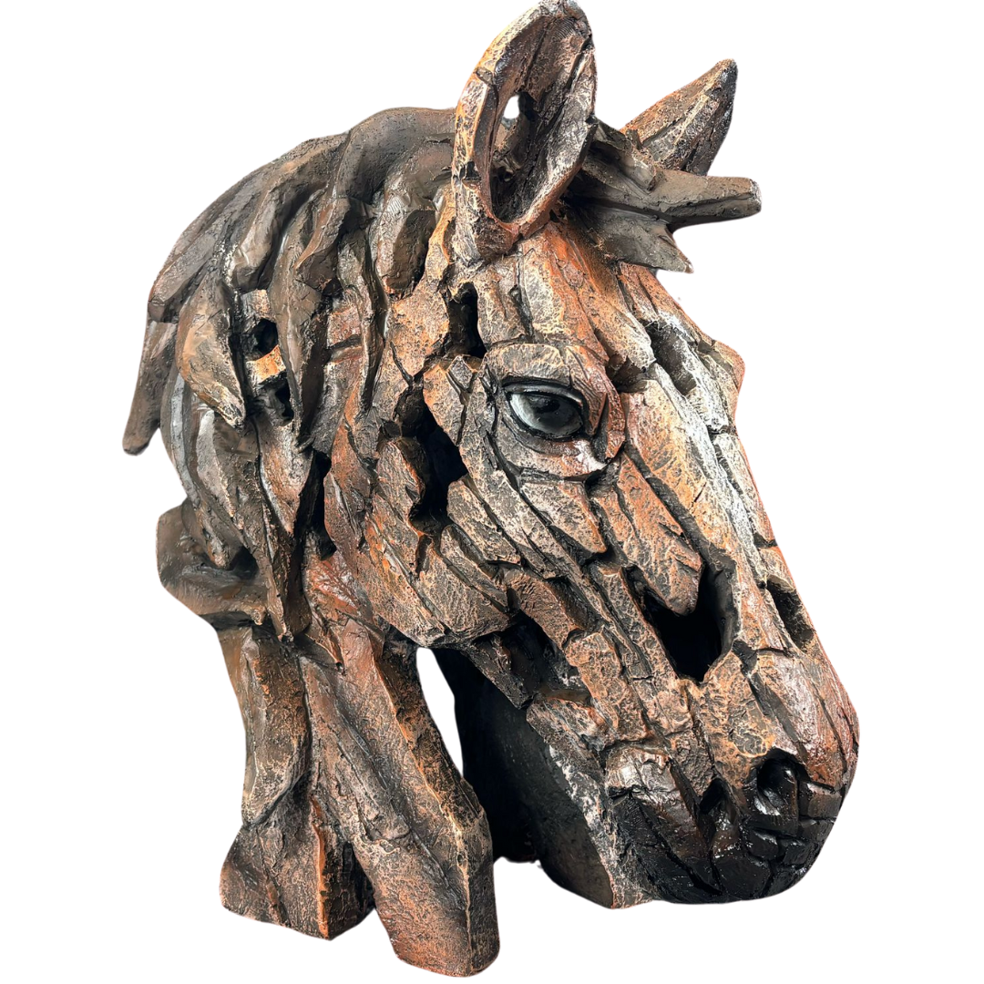Crafted to resemble chiselled stone or weathered wood, the sculpture features layered textures and a fragmented finish that adds dramatic depth and motion to the form. The soulful eye and noble stance of the head capture the quiet intelligence and dignified presence of the horse, making this bust as emotive as it is visually striking.