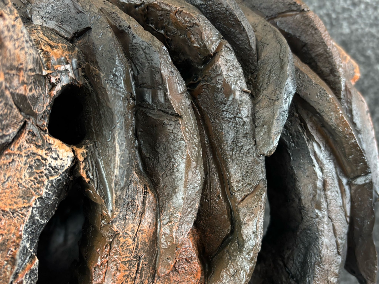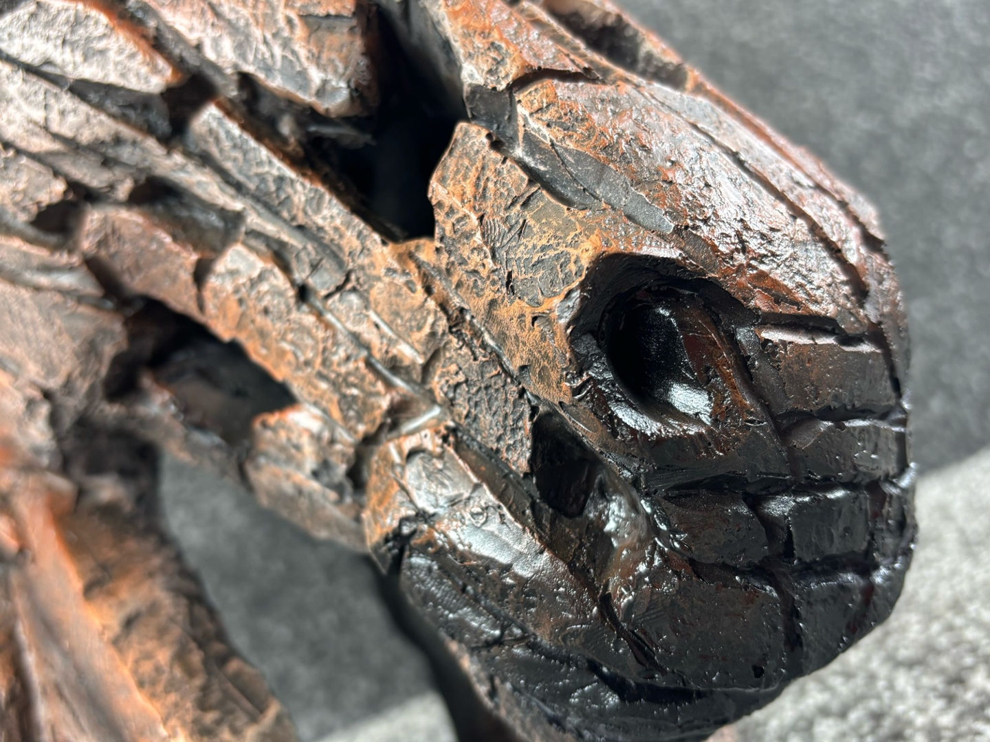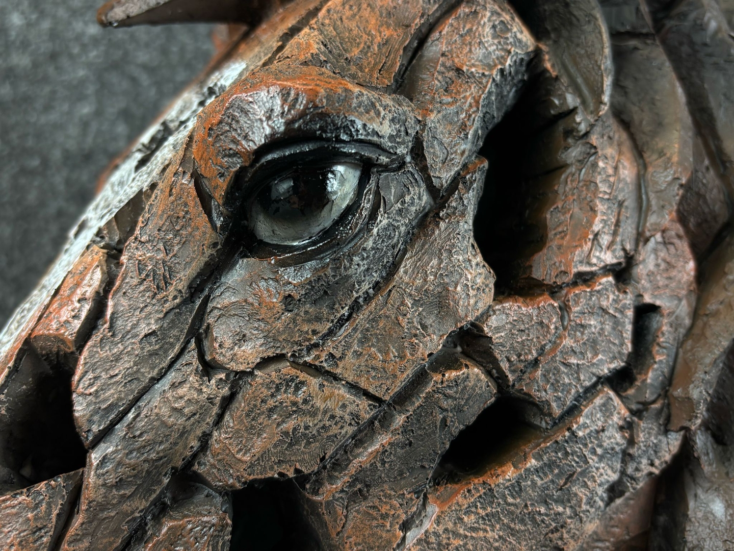 Crafted to resemble chiselled stone or weathered wood, the sculpture features layered textures and a fragmented finish that adds dramatic depth and motion to the form. The soulful eye and noble stance of the head capture the quiet intelligence and dignified presence of the horse, making this bust as emotive as it is visually striking.