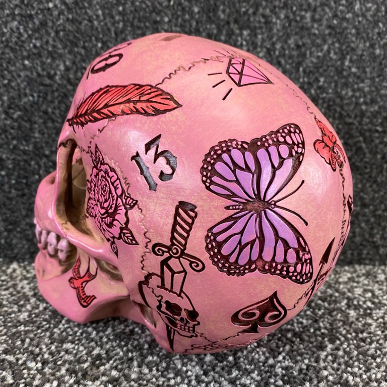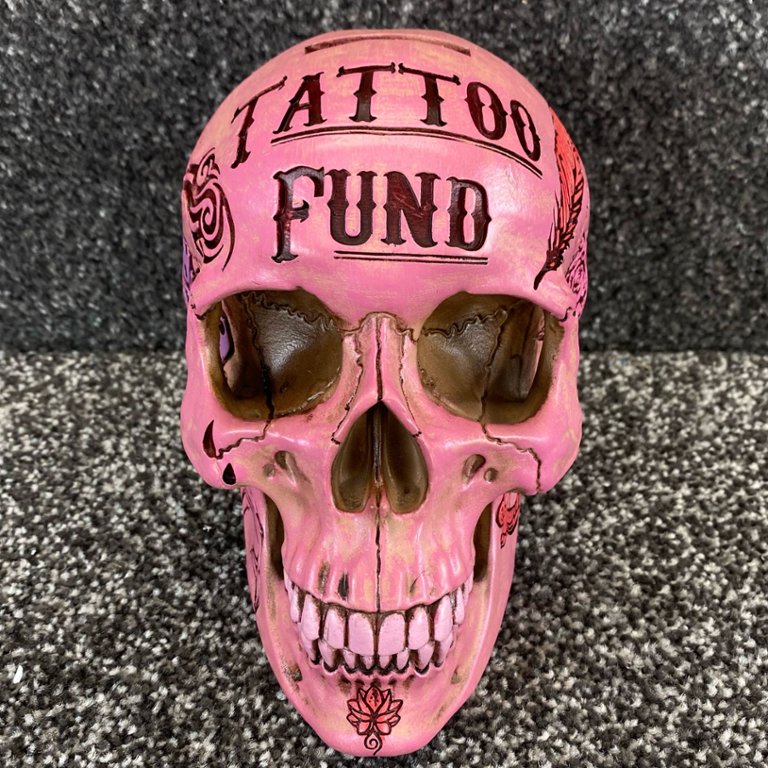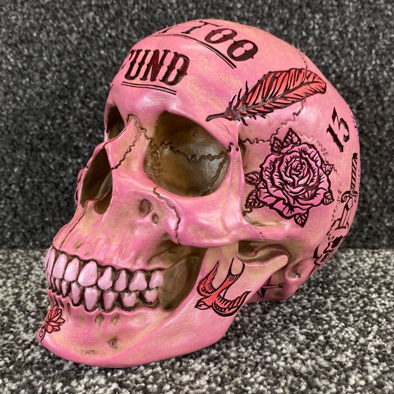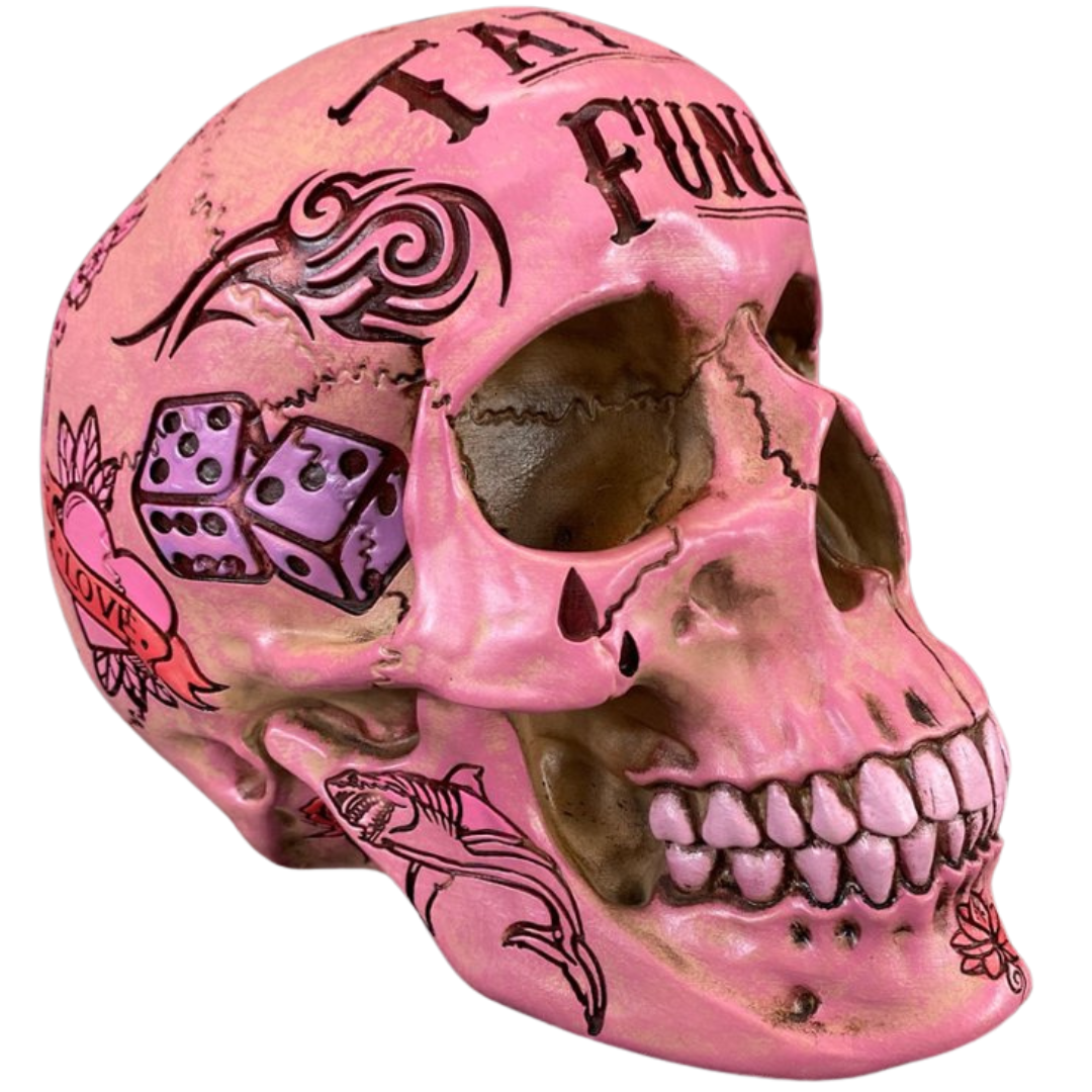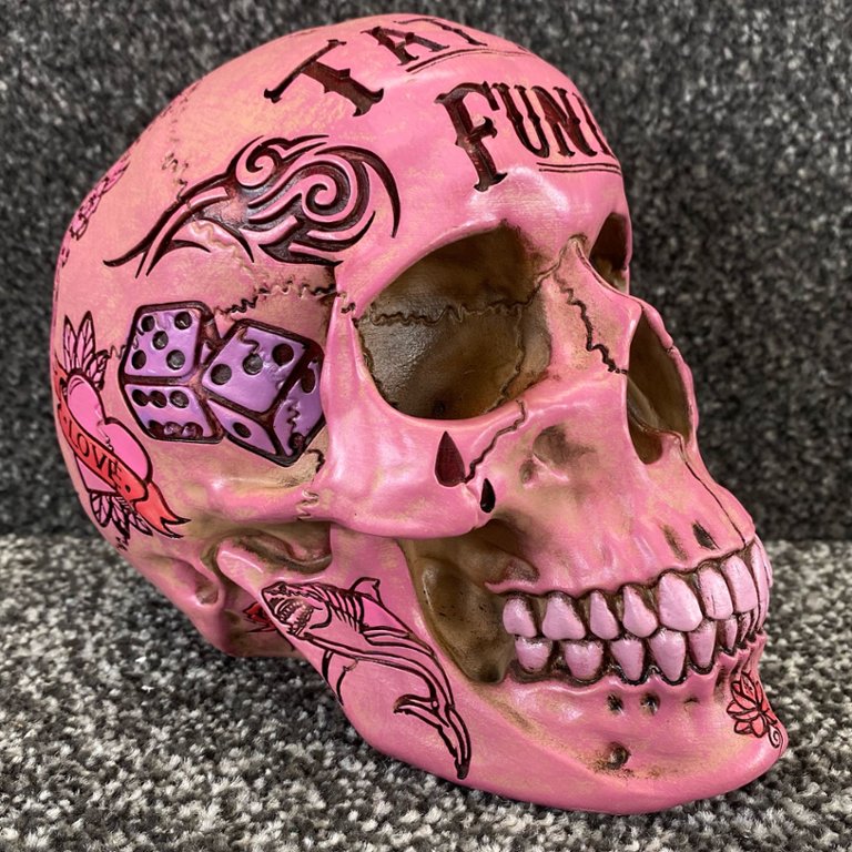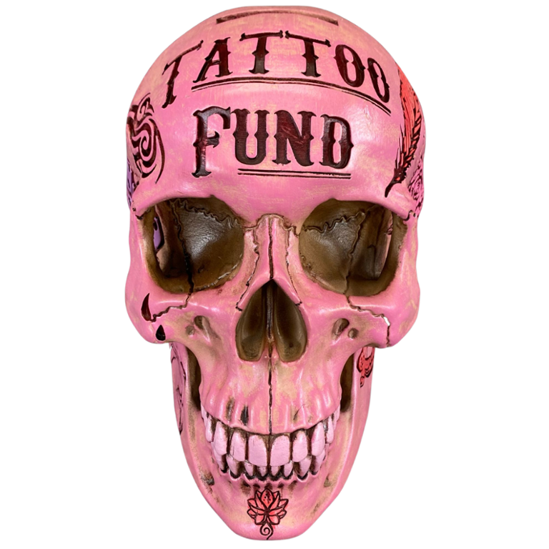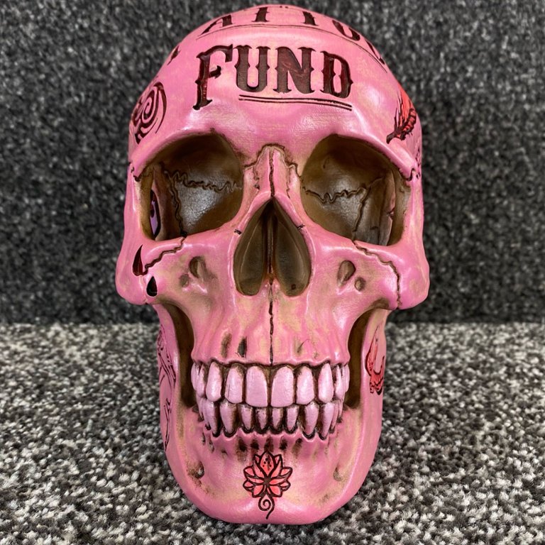 Celebrate the spirit of creativity and individuality with this striking Pink Tattoo Fund Skull sculpture. A symbol of freedom, self-expression, and rebellion, it serves as a reminder to embrace authenticity and live life on your own terms while adding a pop of colour and personality to your surroundings.