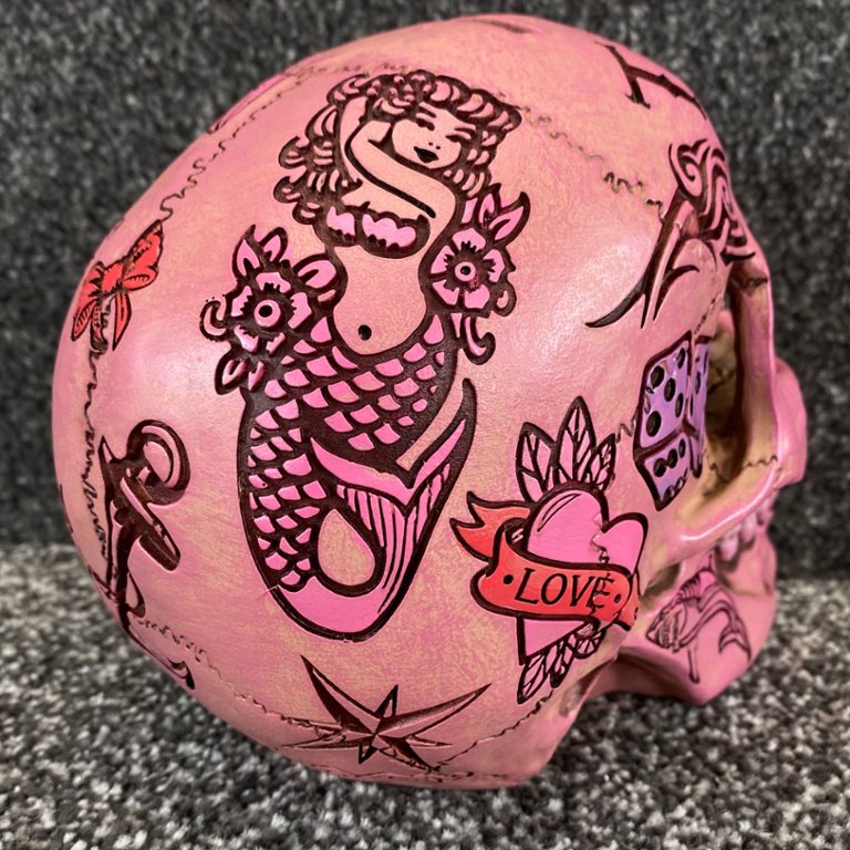 Crafted with meticulous attention to detail, the sculpture features a stylized skull adorned with vibrant pink hues and tattoo-inspired motifs. From intricate designs to playful details, every aspect of the sculpture exudes a sense of individuality and self-expression.