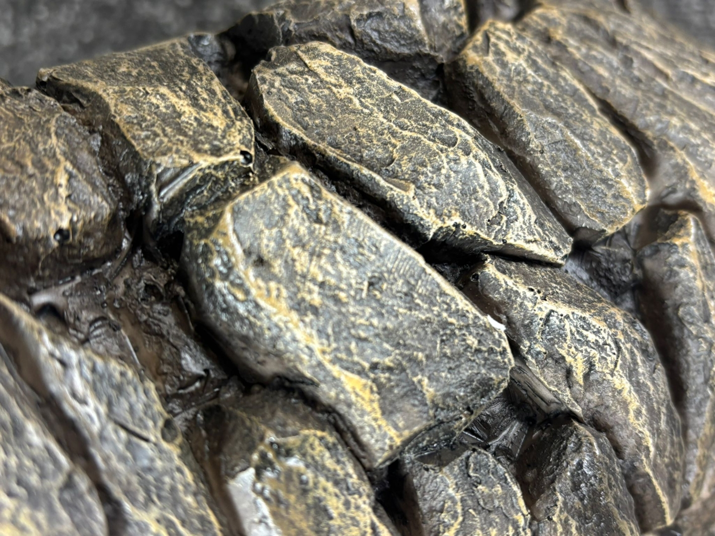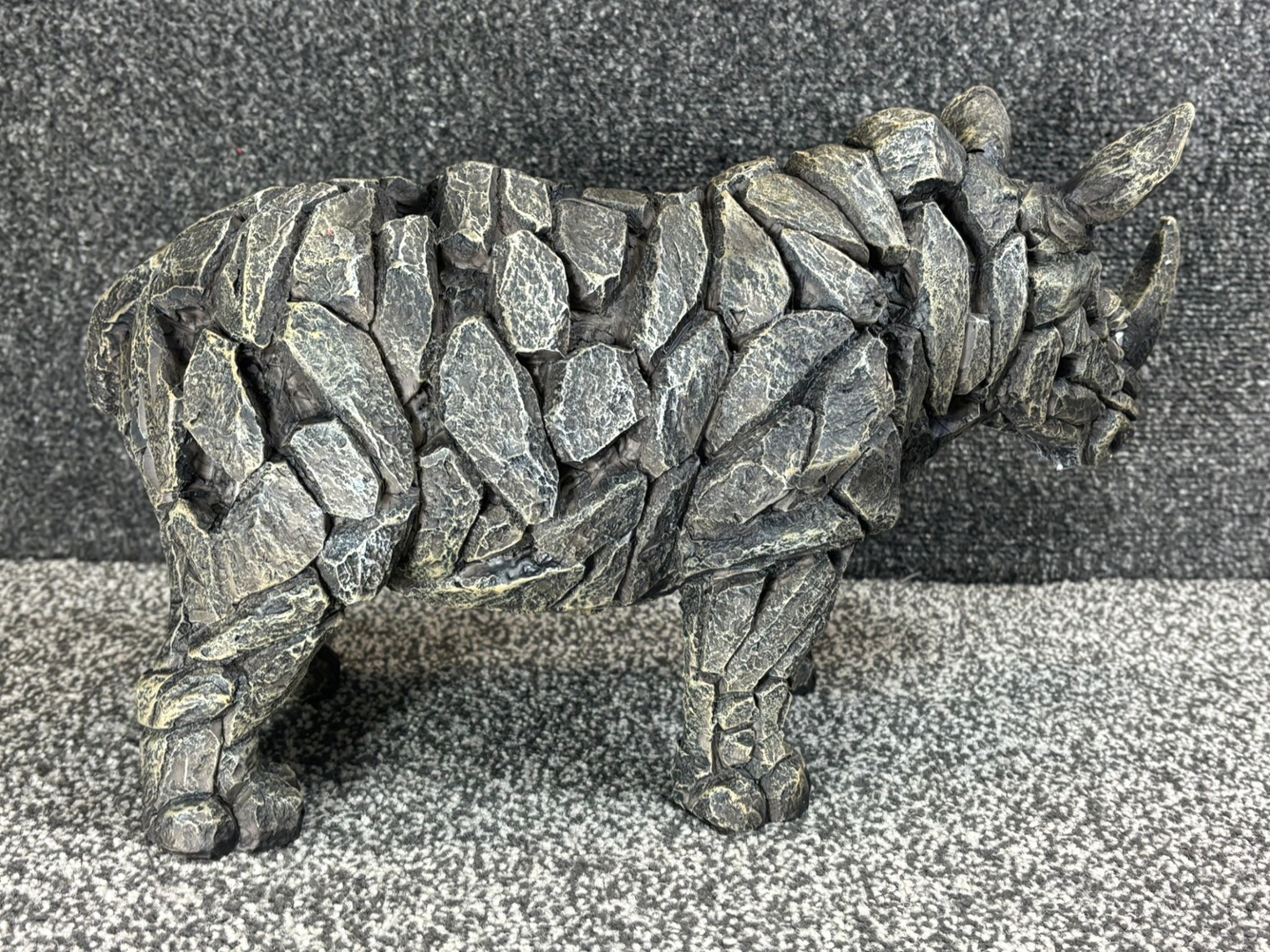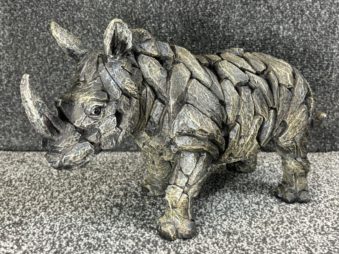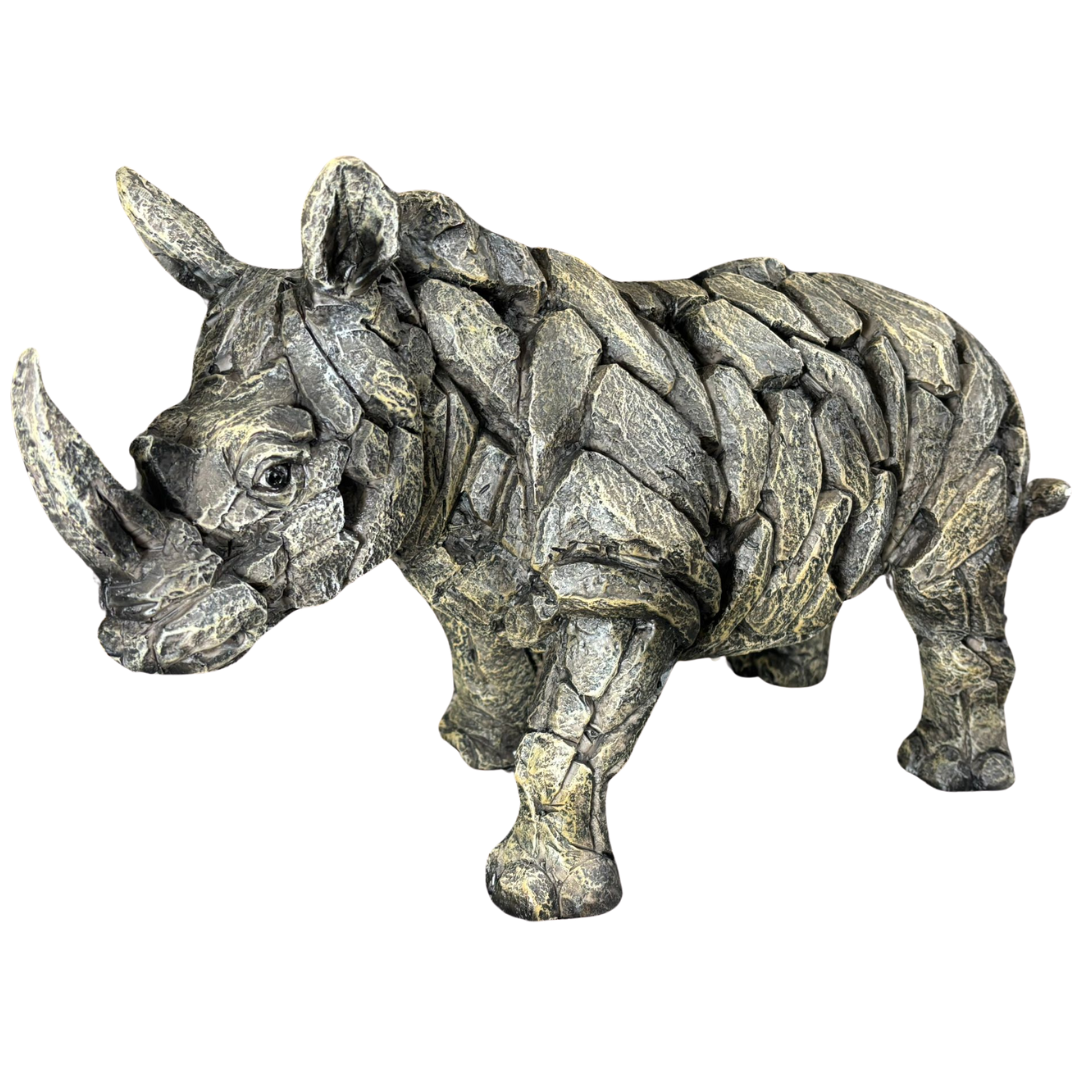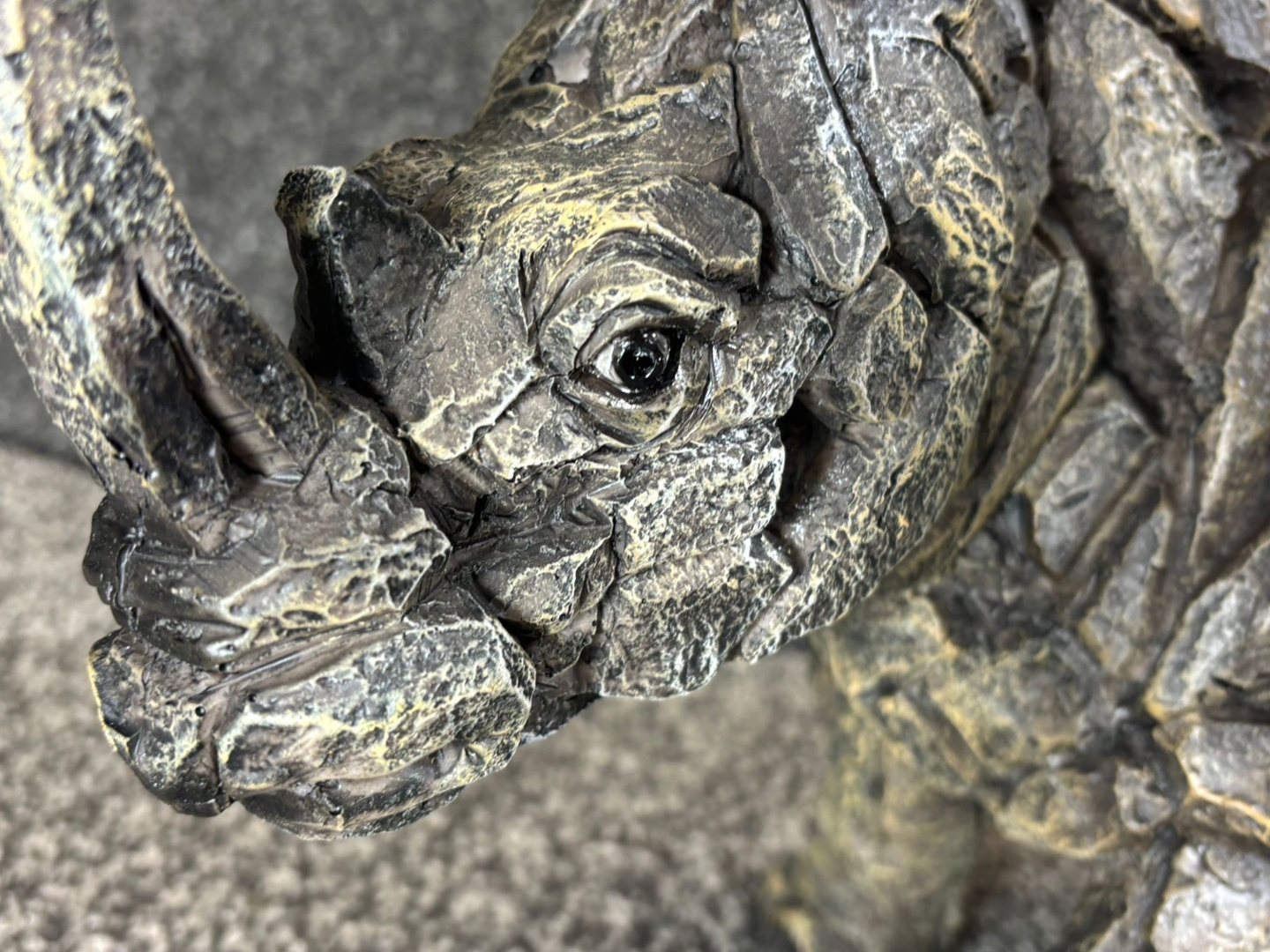 A standing rhinoceros sculpture makes an unforgettable impression. Measuring approximately 24cm in height, 41cm in width, and 16cm in depth, this commanding piece brings the raw power and quiet strength of the rhino to life with stunning detail. Crafted with a layered, stone-like texture, its fragmented design mimics the look of cracked rock or ancient armour, evoking the animal’s natural resilience and primal beauty.