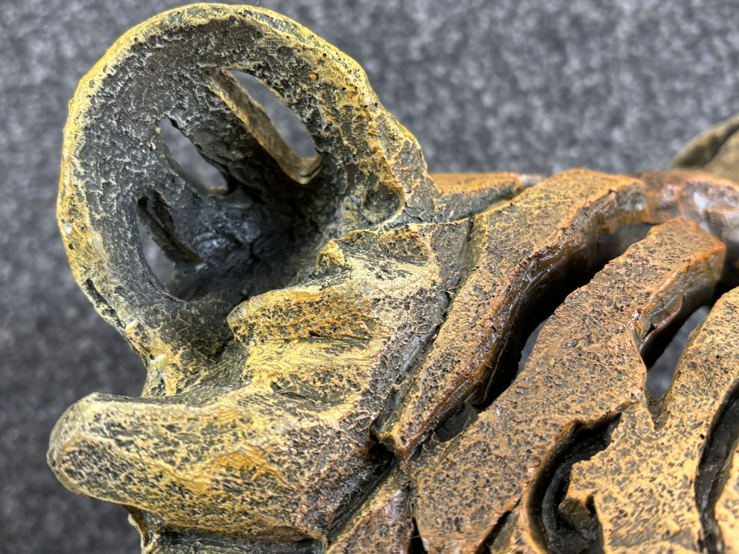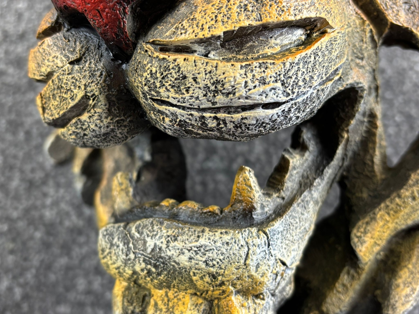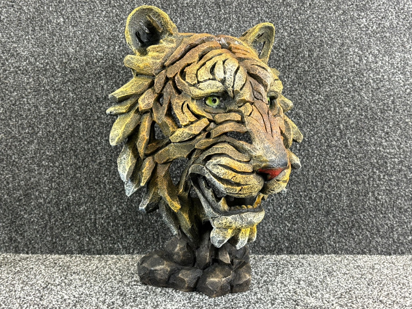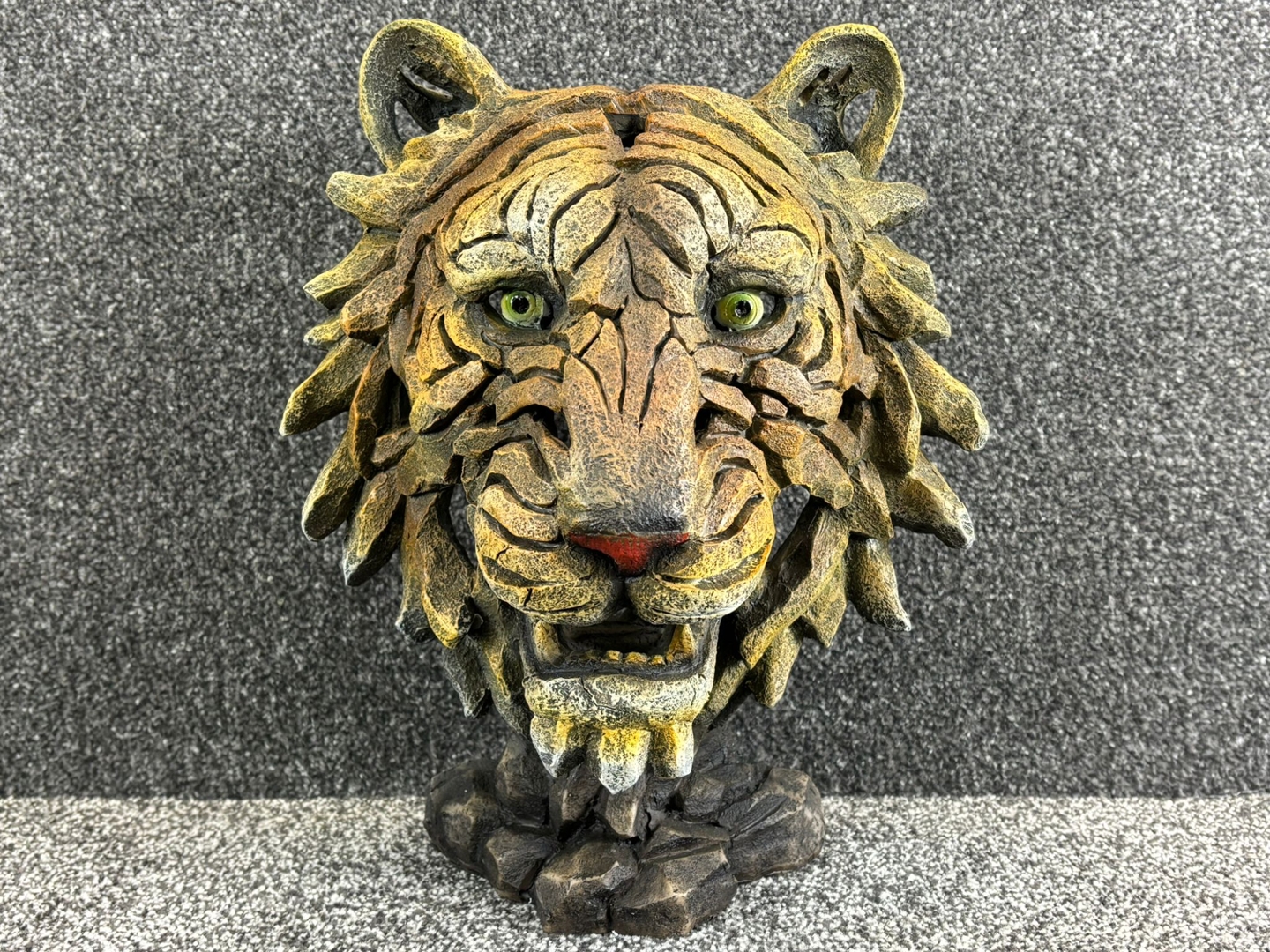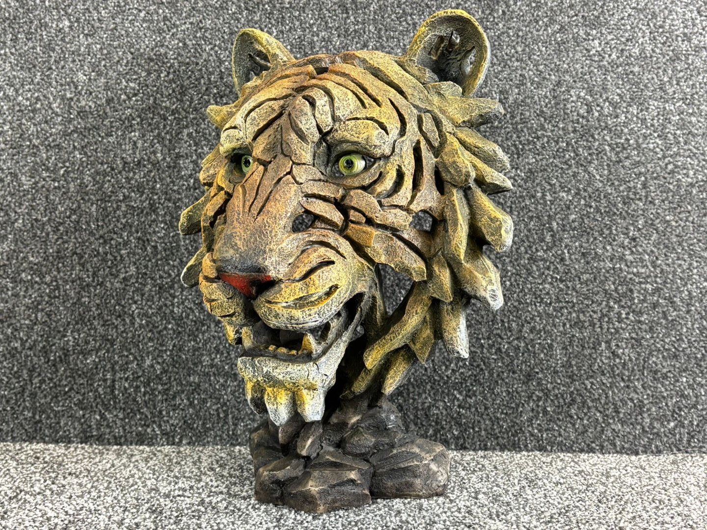 From its piercing green eyes and defined snout to the intricate layers of its textured fur, every curve and contour has been masterfully crafted to evoke realism with a bold, stylised flair. The earthy tones and rugged finish add depth and dimension, making it a true focal point in any space, whether displayed on a mantel, shelf, or desk.