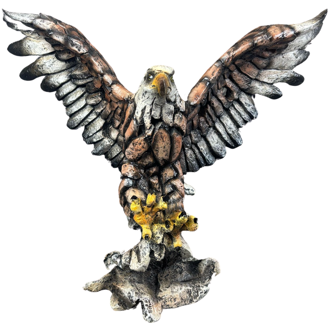 An Eagle Sculpture captures the untamed spirit of the skies in breathtaking detail. Measuring approximately 33cm in height, 41cm in width, and 23cm in depth, this dynamic piece depicts an eagle mid-flight, wings fully spread and talons extended, frozen in a moment of commanding action.