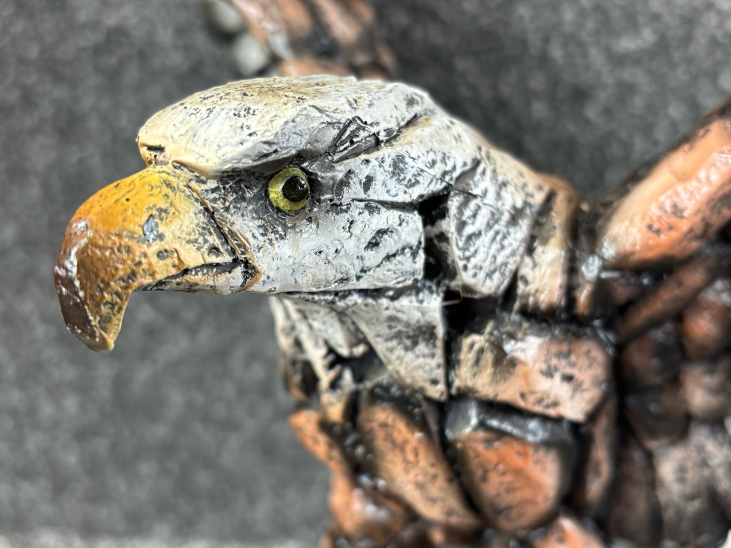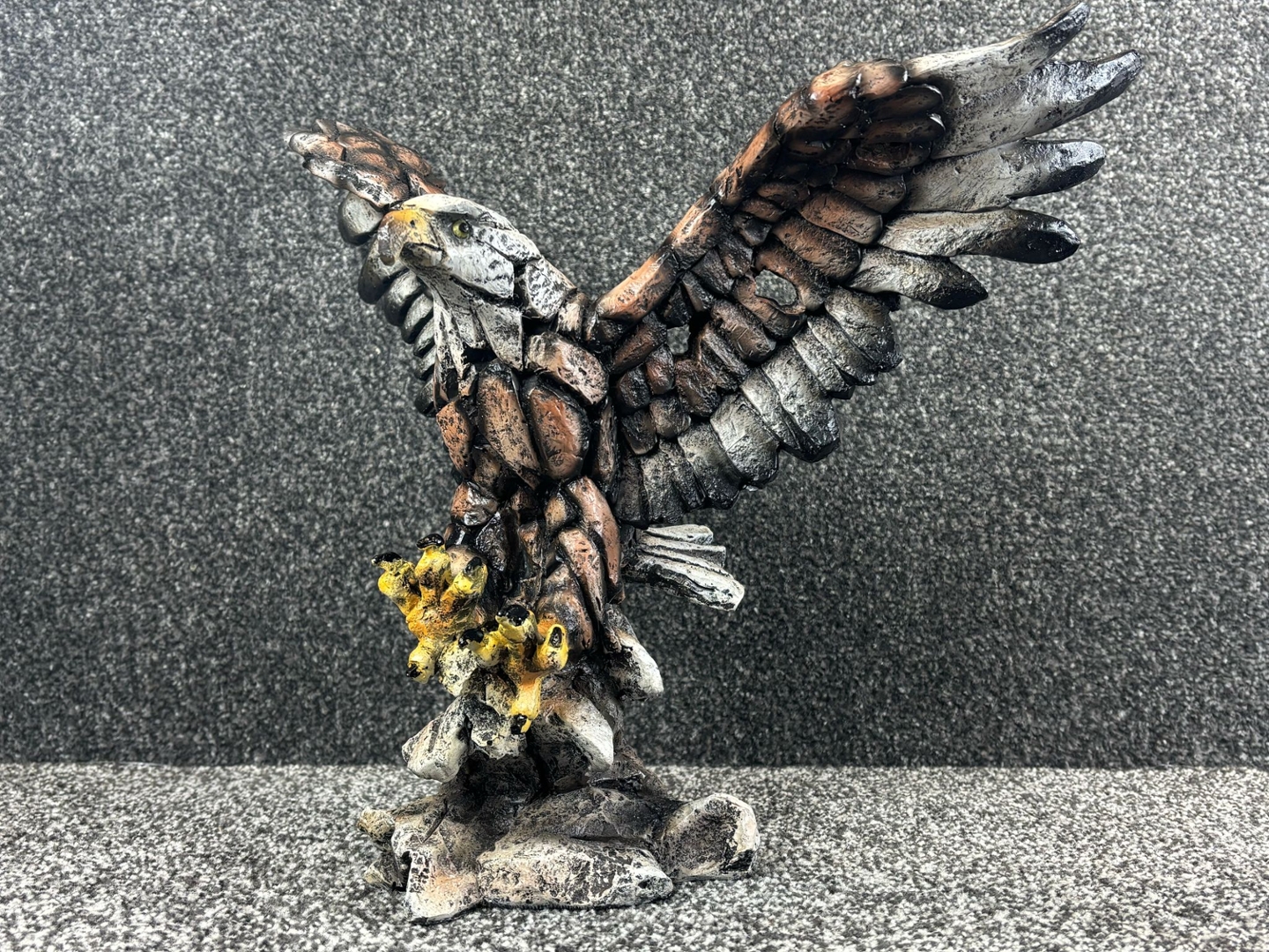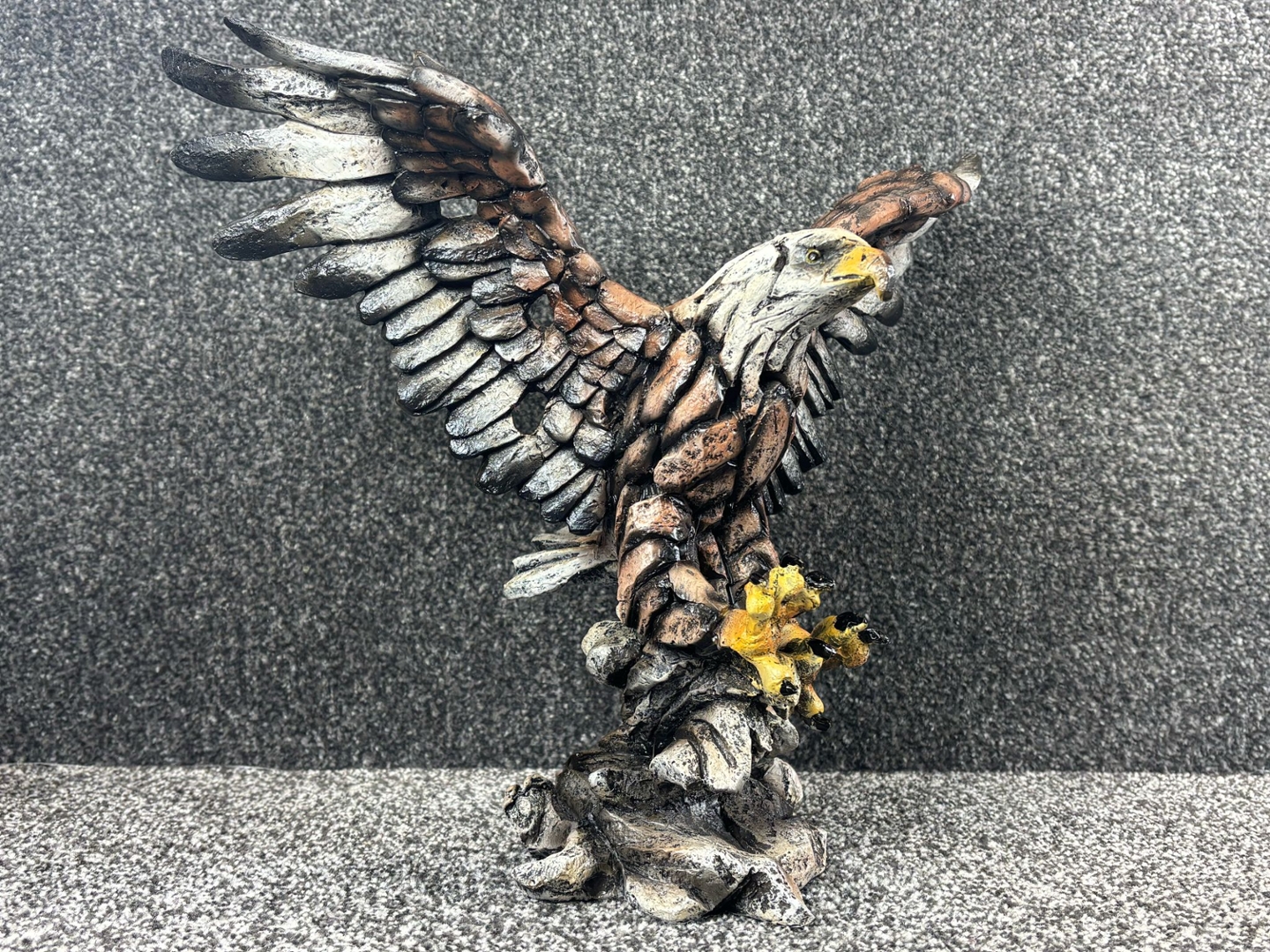 Crafted with a rugged, fragmented texture reminiscent of weathered stone, the sculpture’s design brings together earthy tones of bronze, ivory, and charcoal, accentuated by vibrant yellow talons and a sharp, expressive beak. The layered feathers add depth and movement, making the eagle appear as though it’s about to lift off or strike.