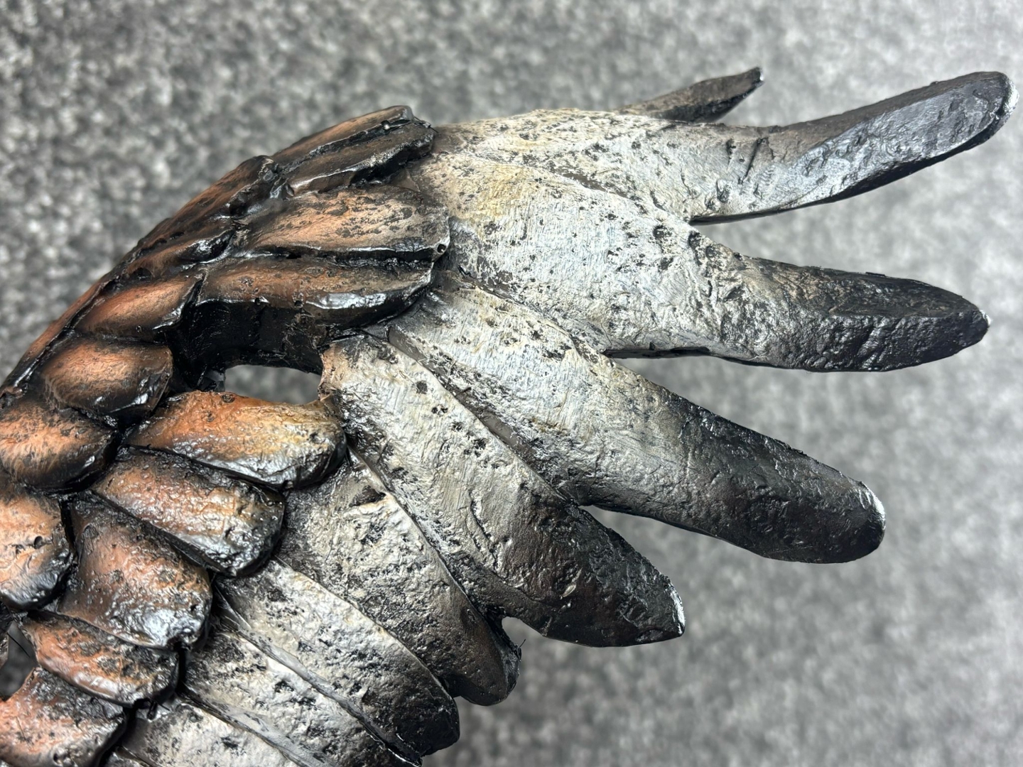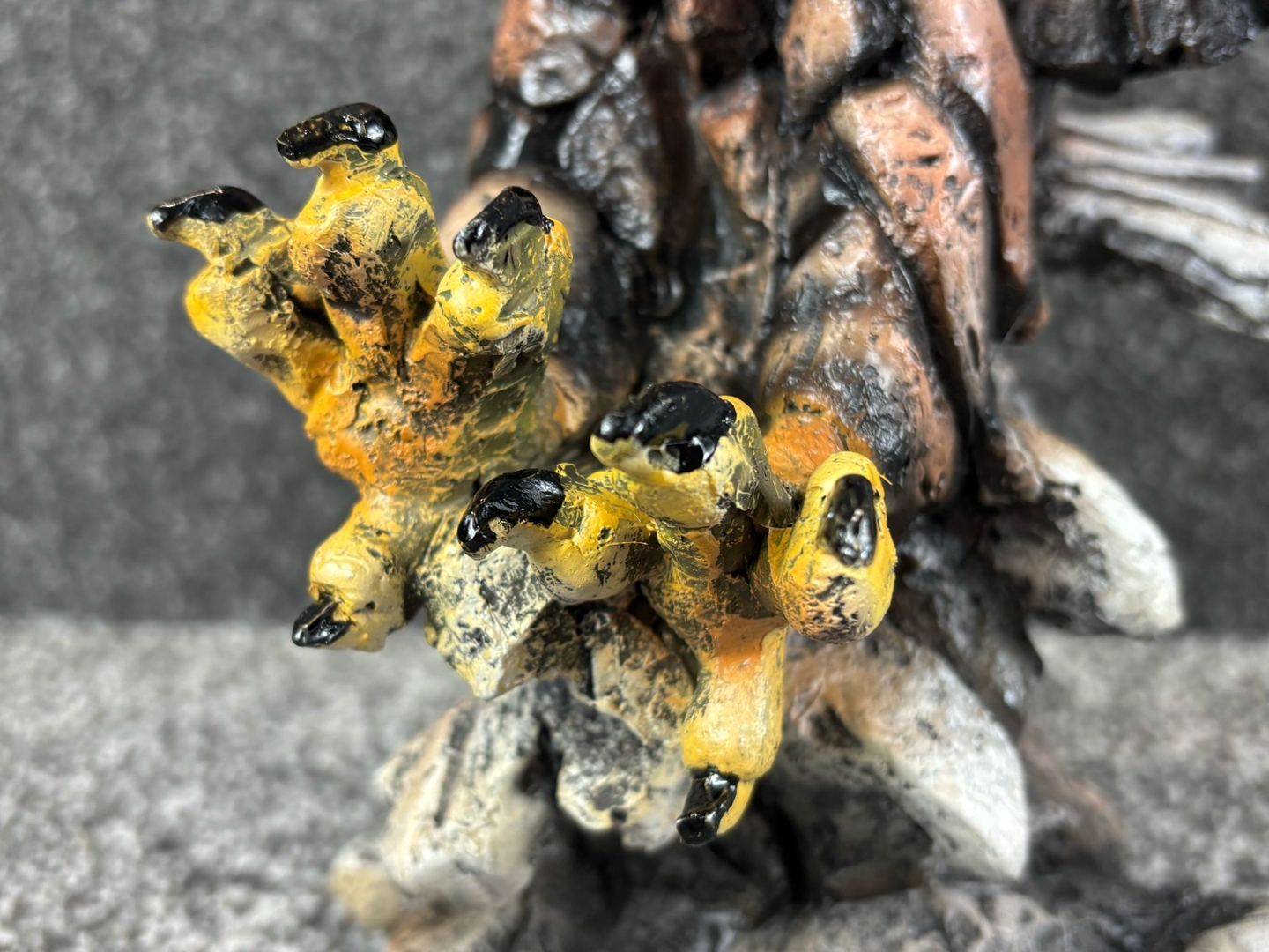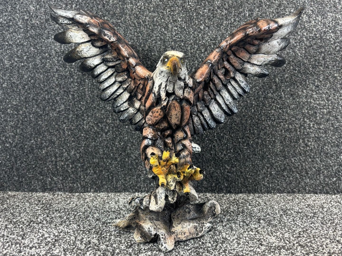 Crafted with a rugged, fragmented texture reminiscent of weathered stone, the sculpture’s design brings together earthy tones of bronze, ivory, and charcoal, accentuated by vibrant yellow talons and a sharp, expressive beak. The layered feathers add depth and movement, making the eagle appear as though it’s about to lift off or strike.