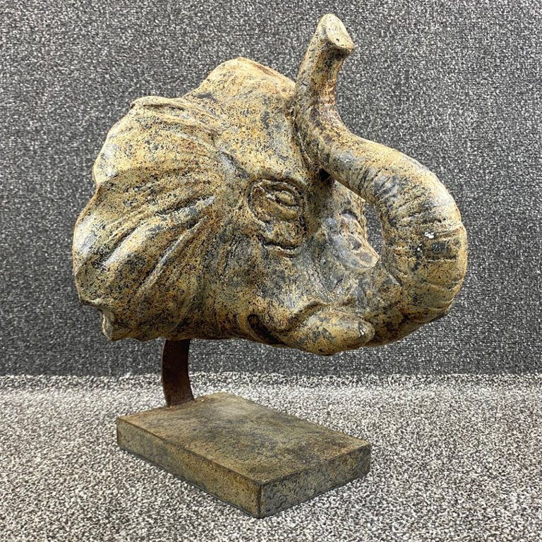 A sculpture of an Elephant Bust on a base. Approx 19" height, 14" width, 15" depth.