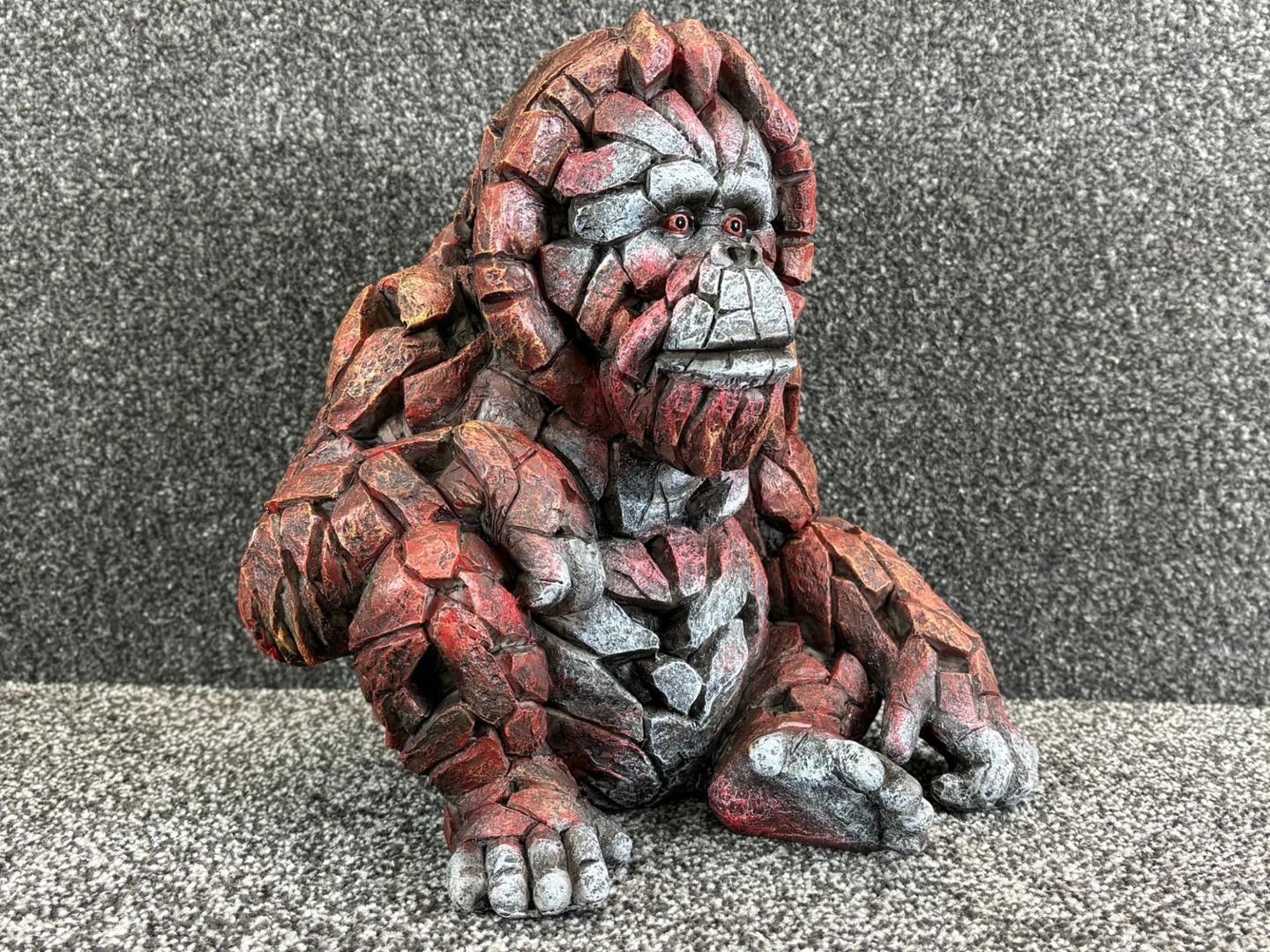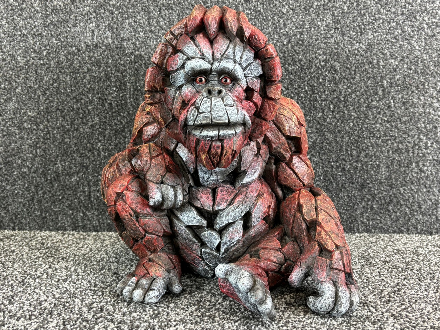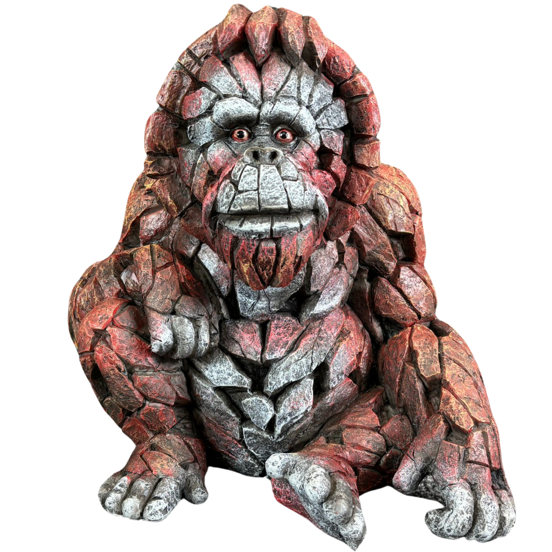 Seated in a relaxed pose, the orangutan’s expressive face and lifelike features are beautifully rendered in textured layers that mimic carved stone, highlighted with rich tones of burnt orange and earthy grey. The intricate sculpting of the fur, hands, and facial expression gives the piece depth and personality, making it feel alive with character.