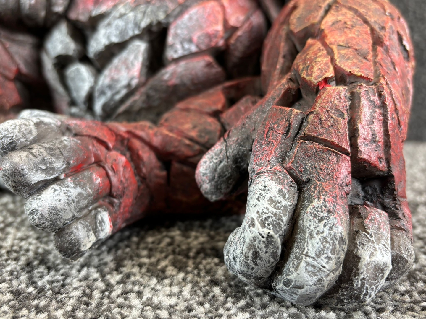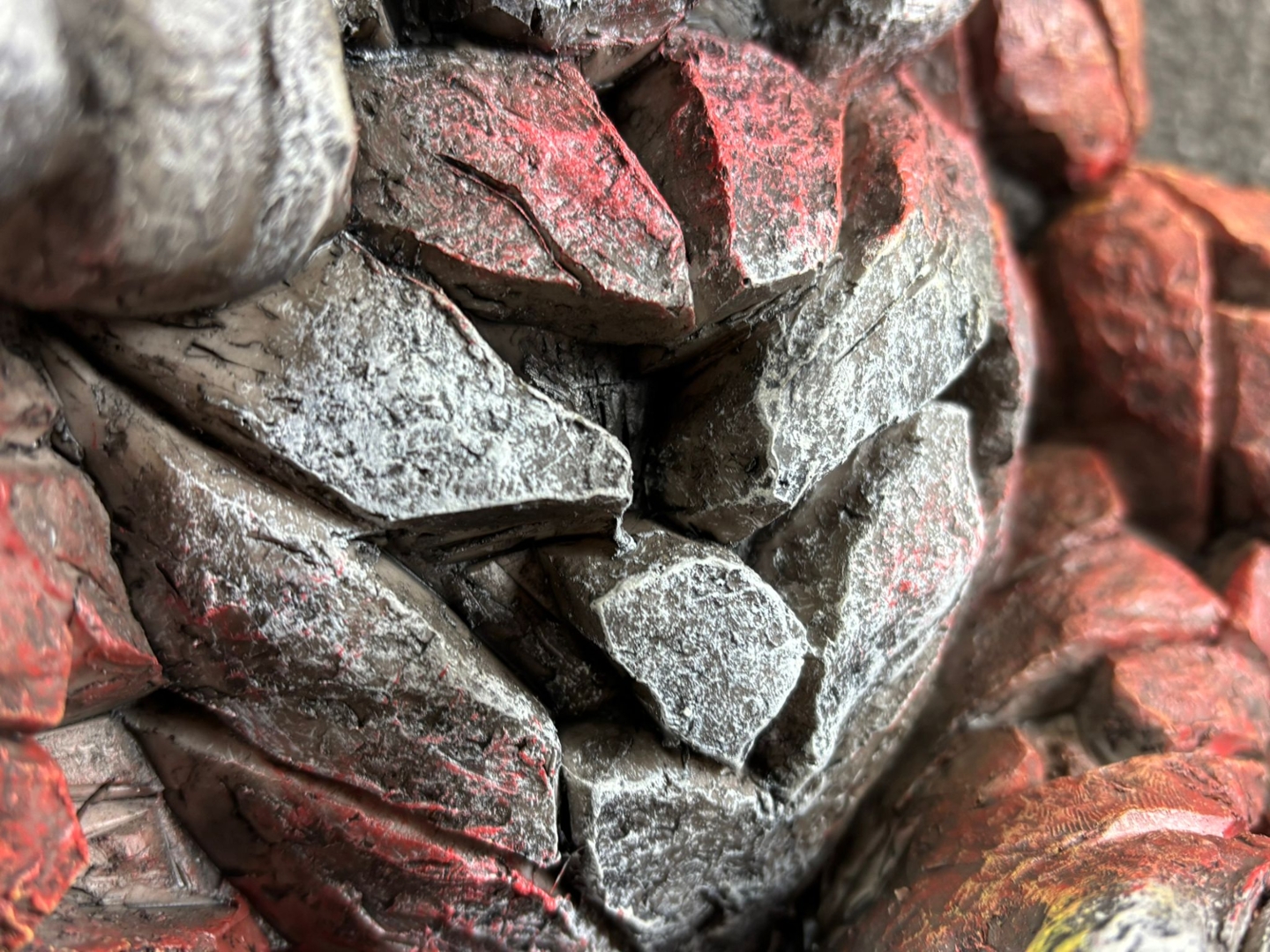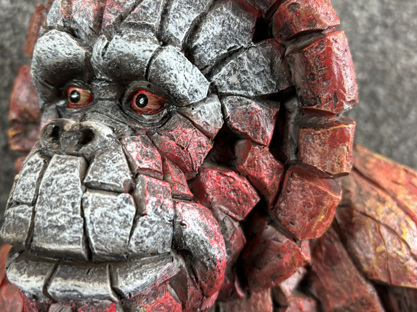 Seated in a relaxed pose, the orangutan’s expressive face and lifelike features are beautifully rendered in textured layers that mimic carved stone, highlighted with rich tones of burnt orange and earthy grey. The intricate sculpting of the fur, hands, and facial expression gives the piece depth and personality, making it feel alive with character.