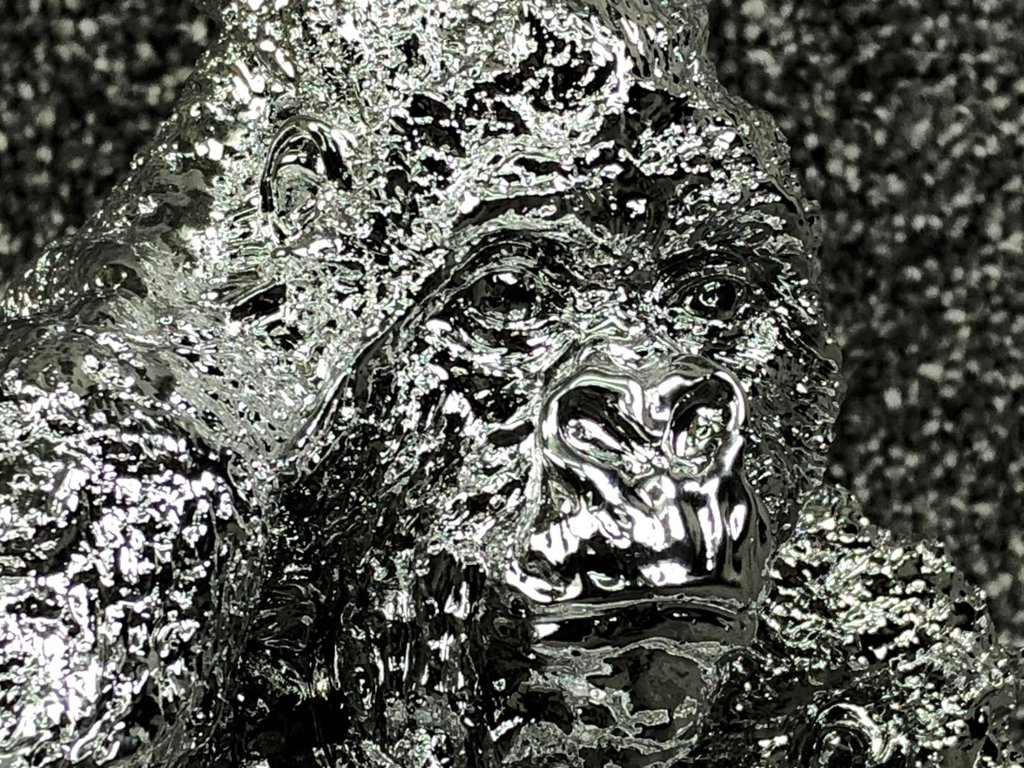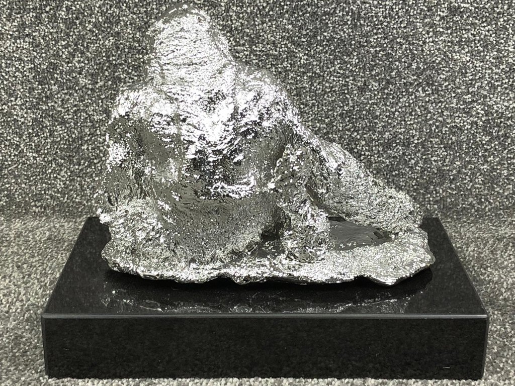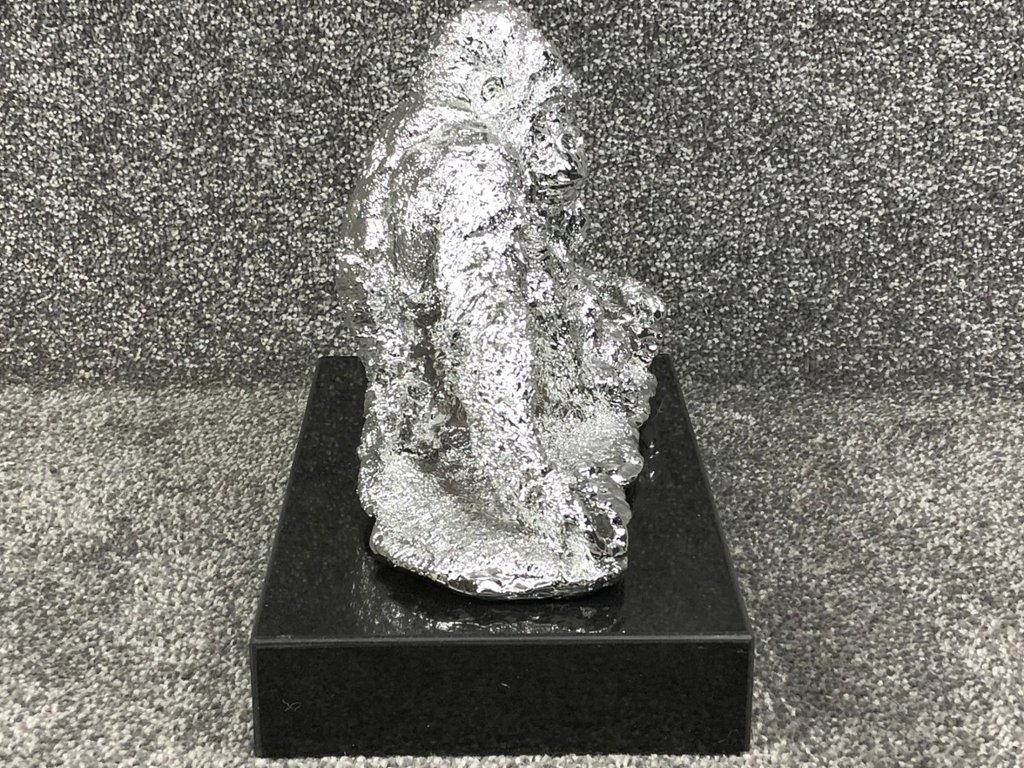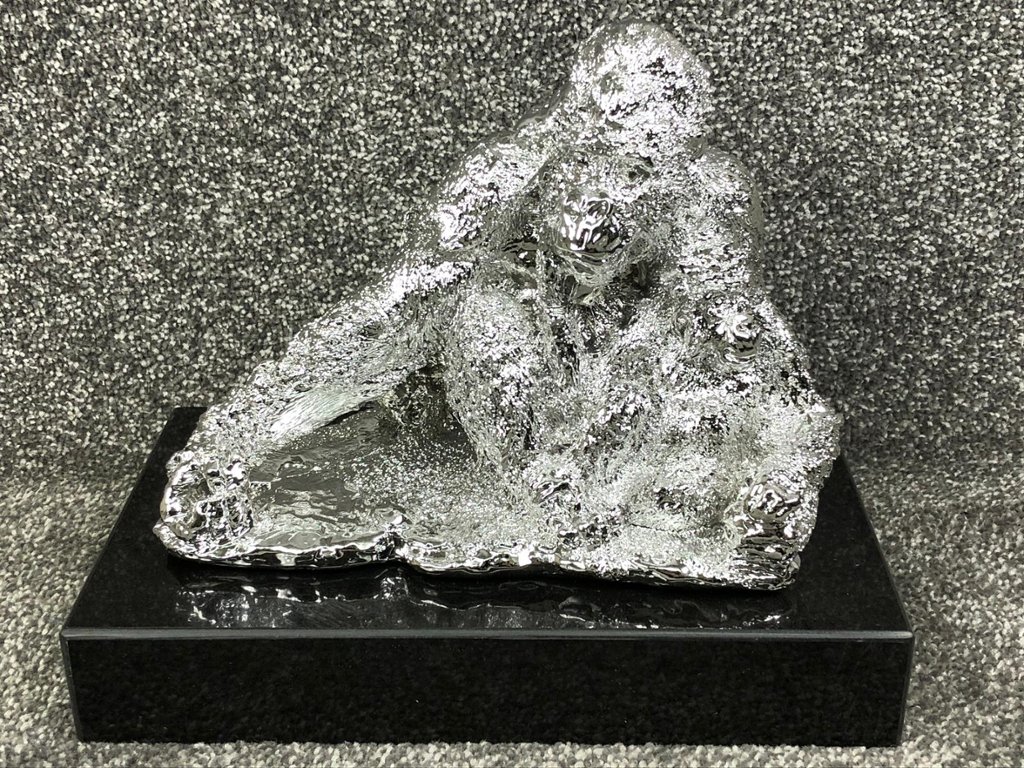 A silver sculpture of a Gorilla and infants on a marble base. Approx 10" height, 12" width.