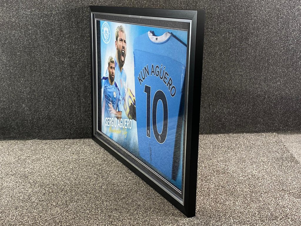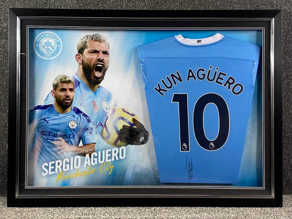 A signed & authenticated Sergio Aguero Man City Shirt in a light-up presentation frame. Approx 31" height, 43" width.